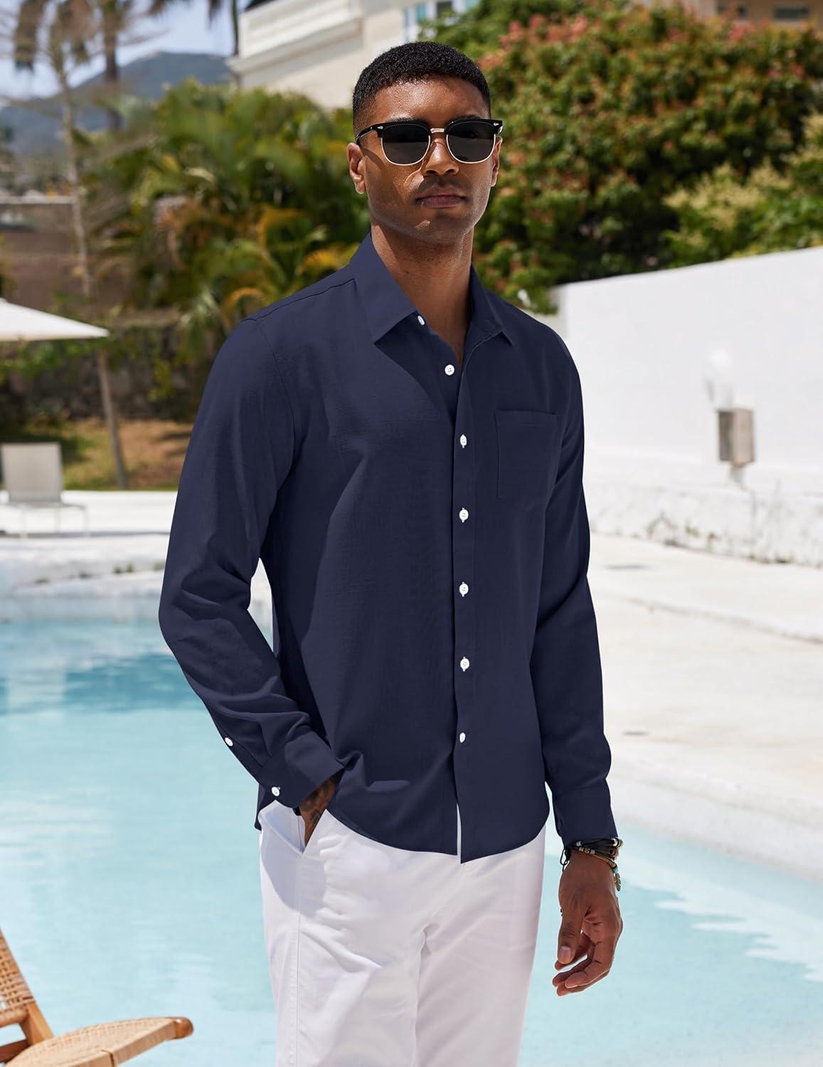 COOFANDY Mens Button Down Shirts Short Sleeve Casual Summer Beach Shirts for Men Vacation Wedding Linen Shirt(Dark Blue)