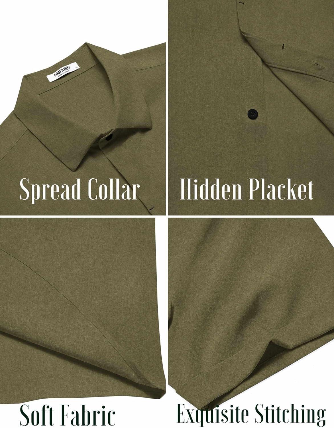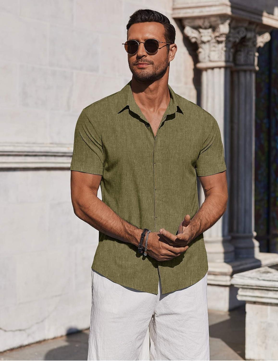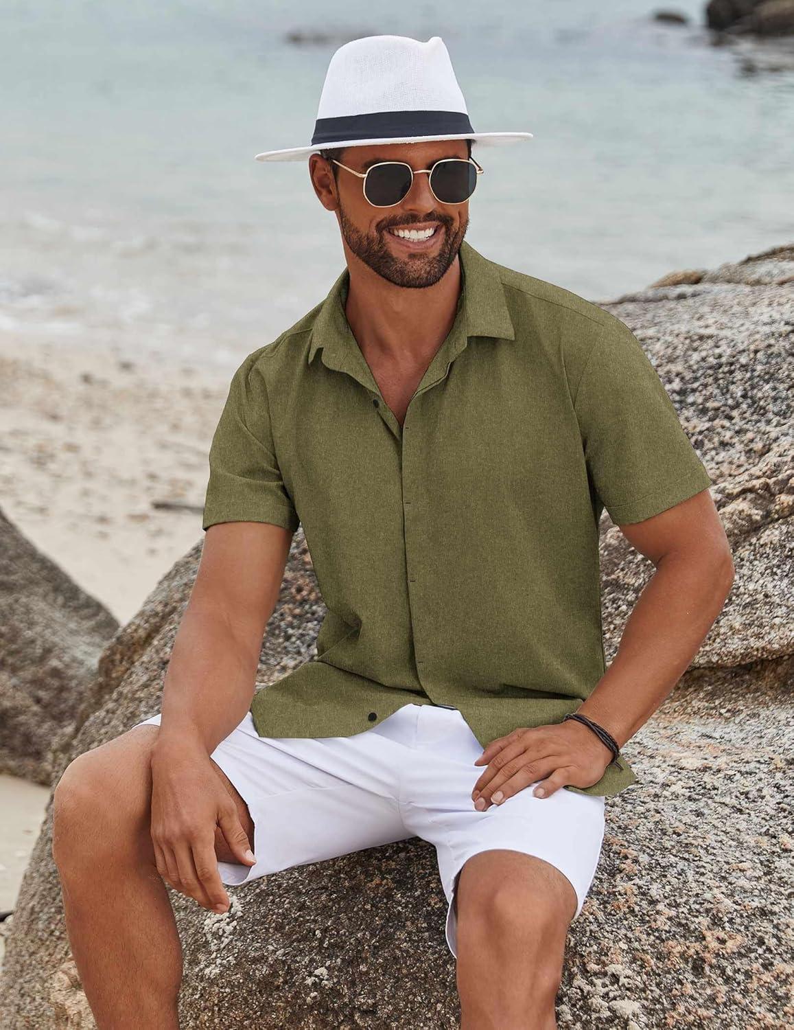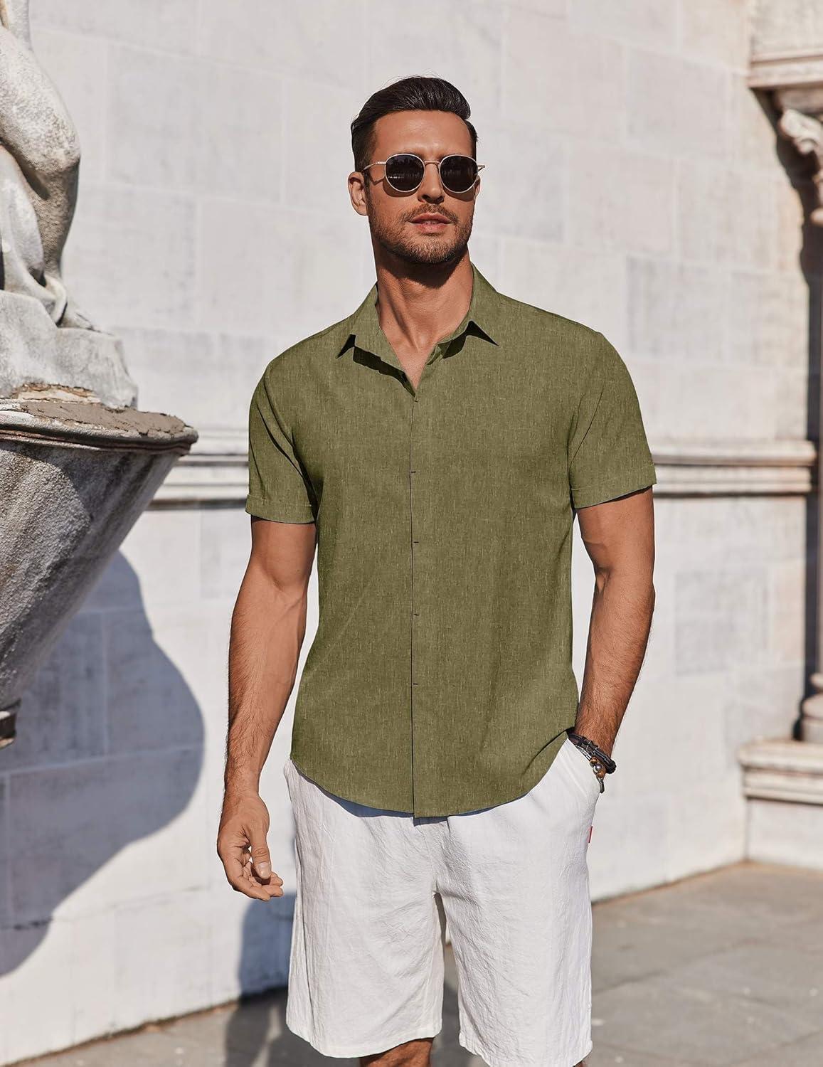 COOFANDY Mens Button Down Shirts Short Sleeve Casual Summer Beach Shirts for Men Vacation Wedding Linen Shirt(Army Green)