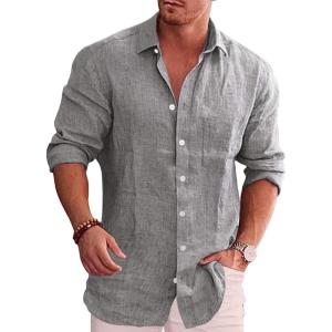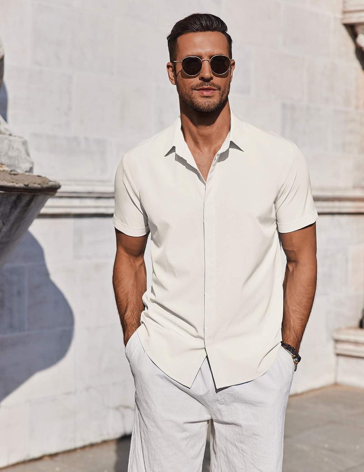 COOFANDY Mens Button Down Shirts Short Sleeve Casual Summer Beach Shirts for Men Vacation Wedding Linen Shirt(1- Light Grey)