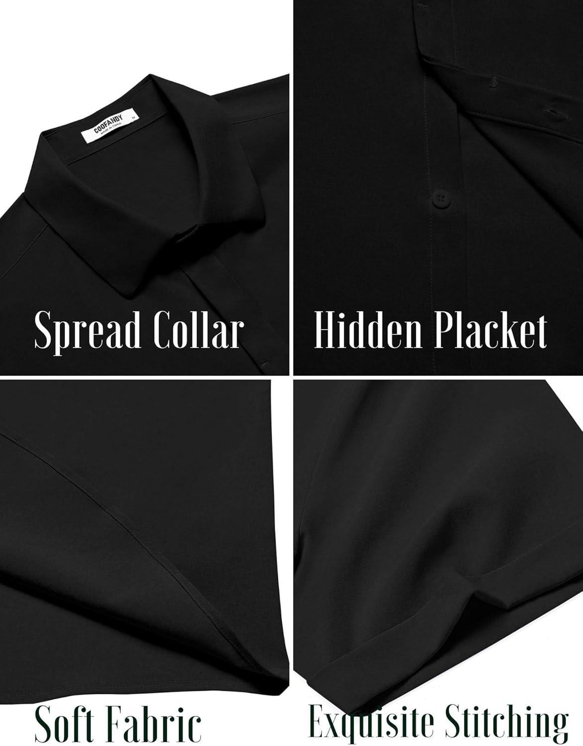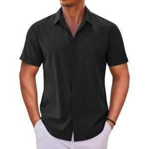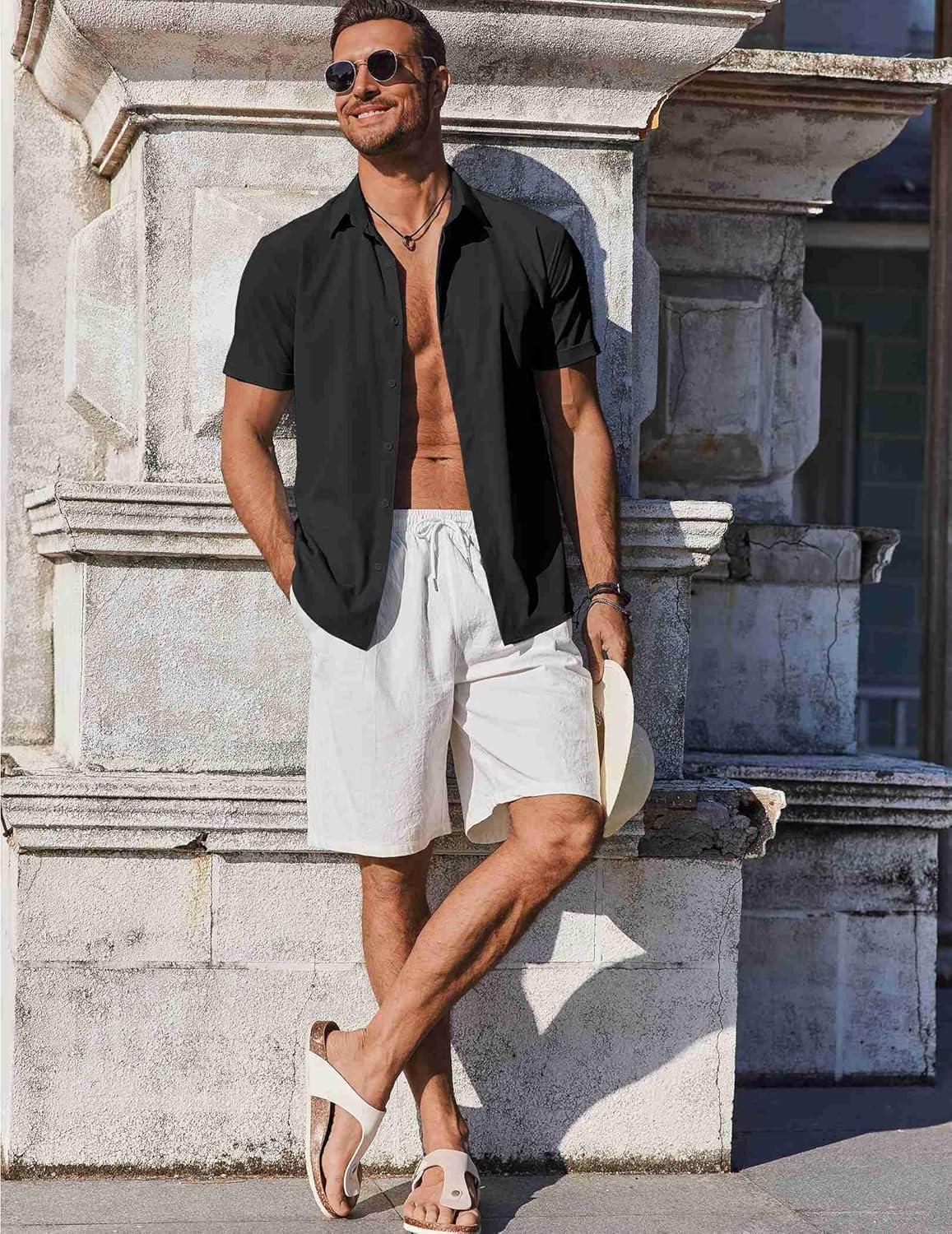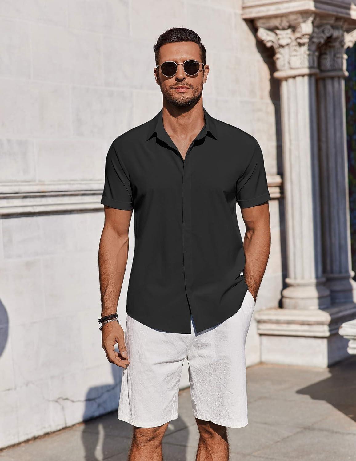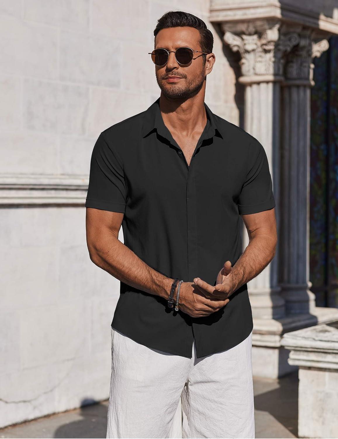 COOFANDY Mens Button Down Shirts Short Sleeve Casual Summer Beach Shirts for Men Vacation Wedding Linen Shirt(Black)