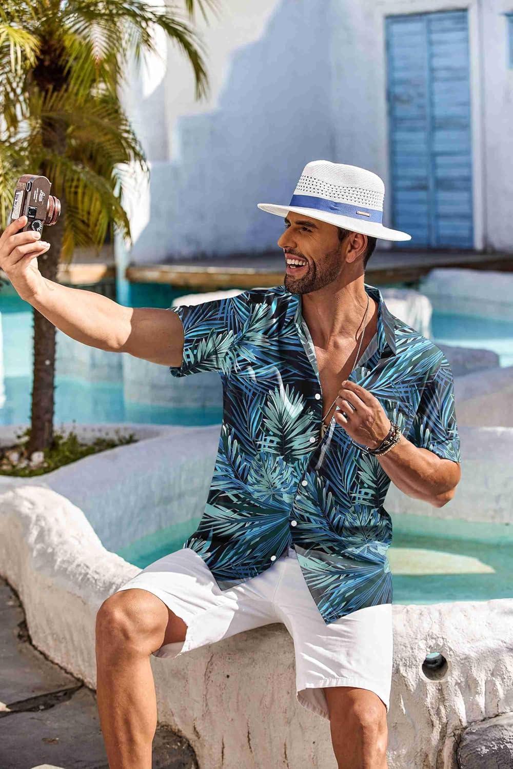 COOFANDY Mens Button Down Shirts Short Sleeve Casual Summer Beach Shirts for Men Vacation Wedding Linen Shirt(Blue & Green – Leaf)