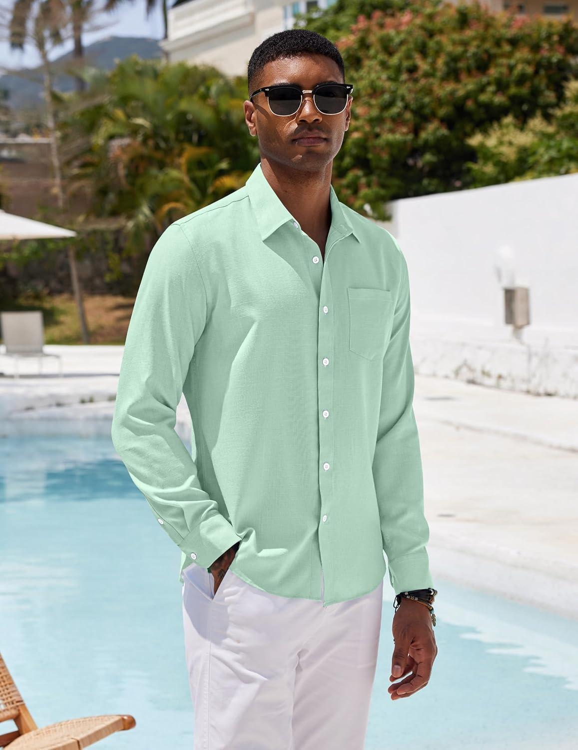 COOFANDY Mens Button Down Shirts Short Sleeve Casual Summer Beach Shirts for Men Vacation Wedding Linen Shirt(Bright Green)