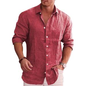 COOFANDY Mens Button Down Shirts Short Sleeve Casual Summer Beach Shirts for Men Vacation Wedding Linen Shirt(1- Red)