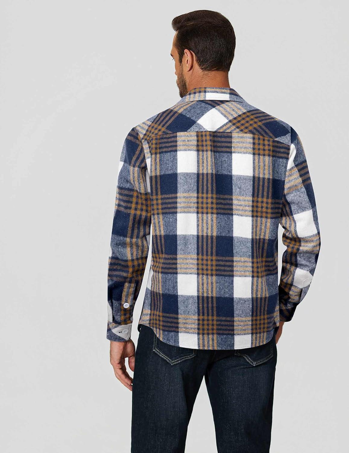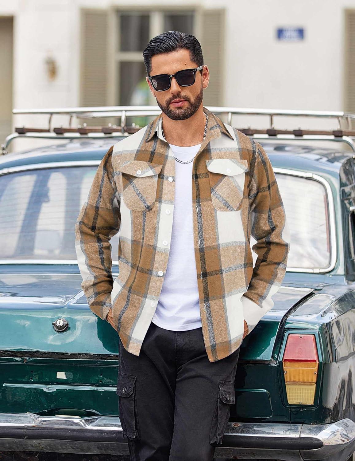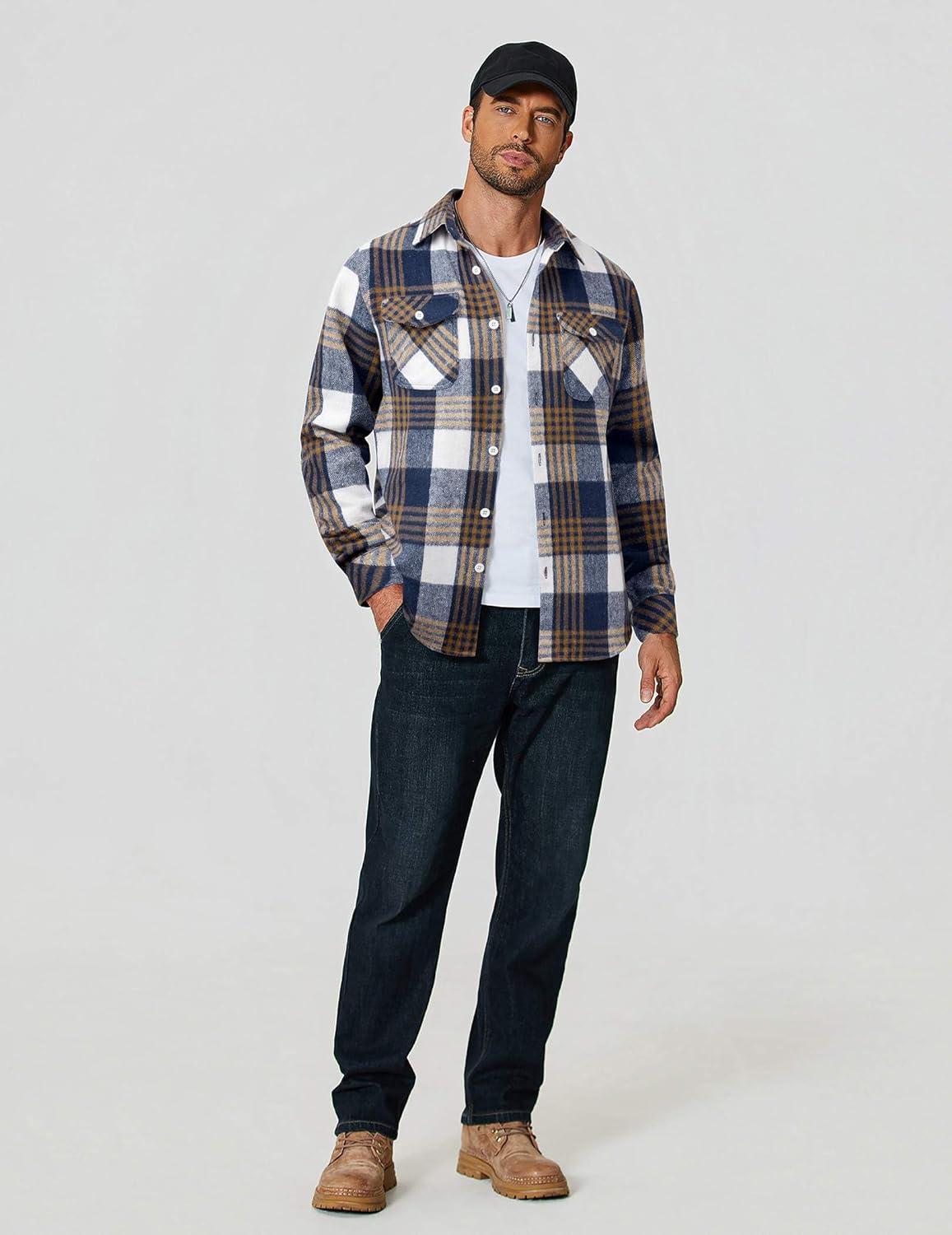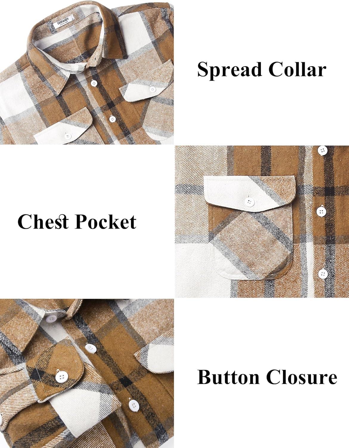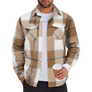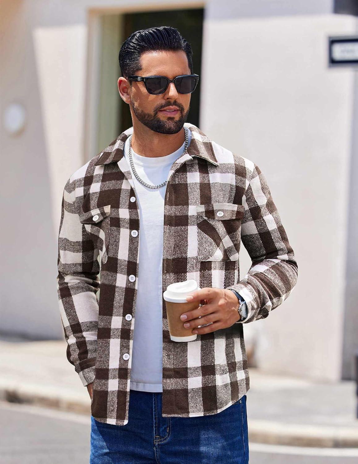 • COOFANDY Men Flannel Shirt Casual Button Down Shirt Jacket Long Sleeve Plaid Shirts with Pockets(Brown White)