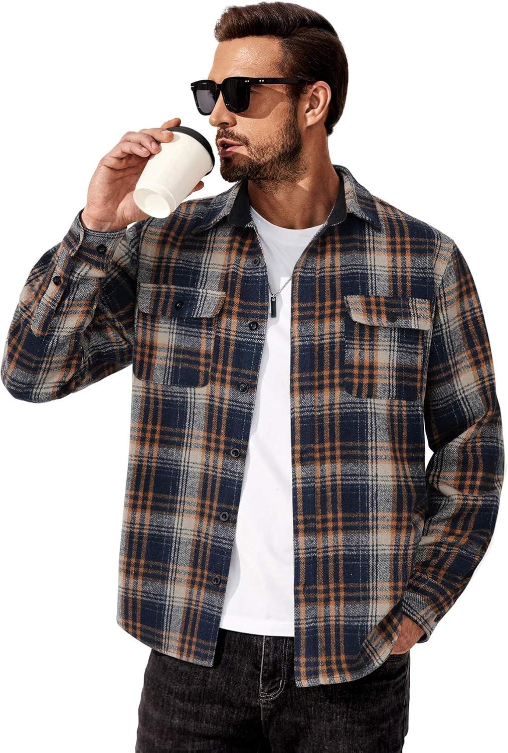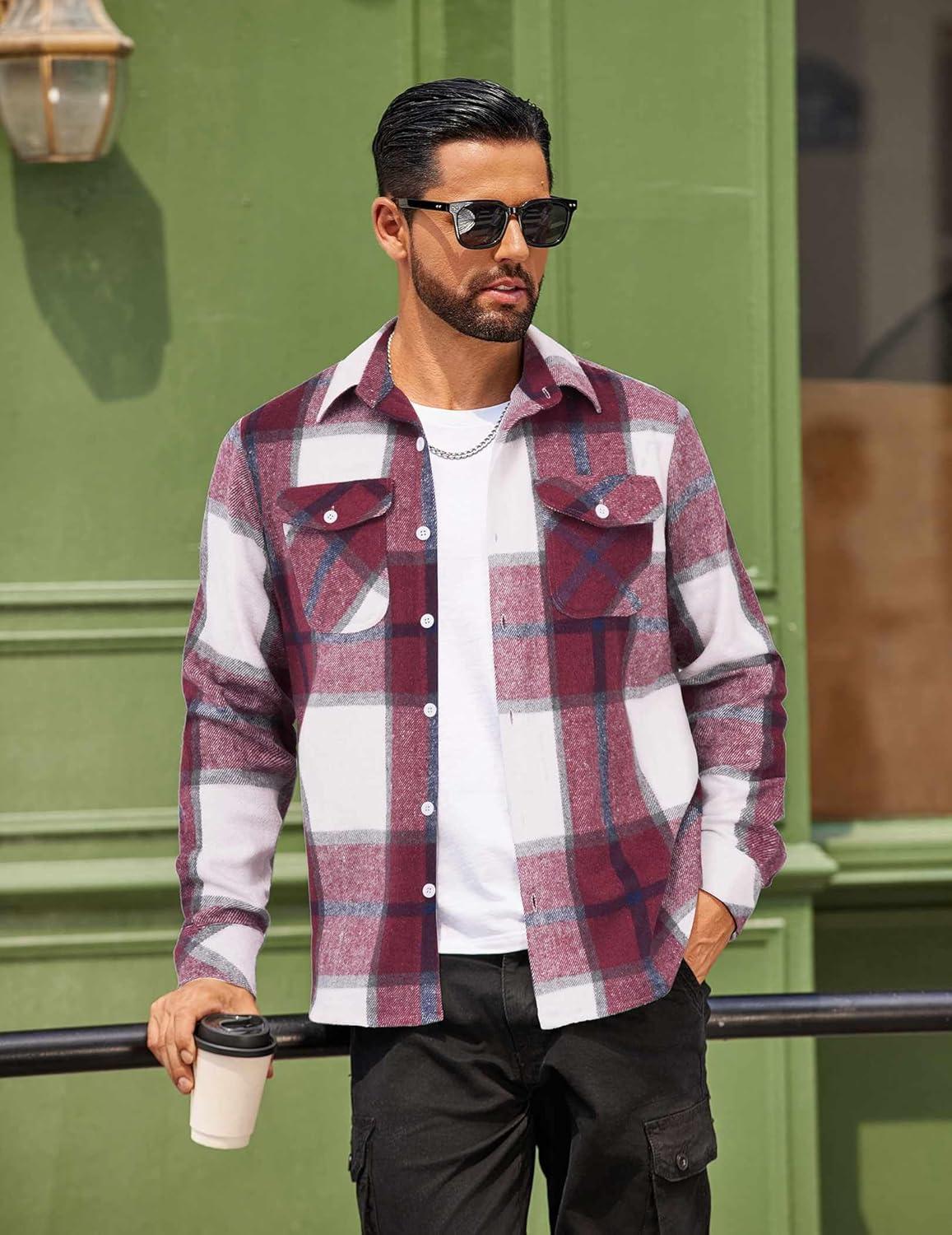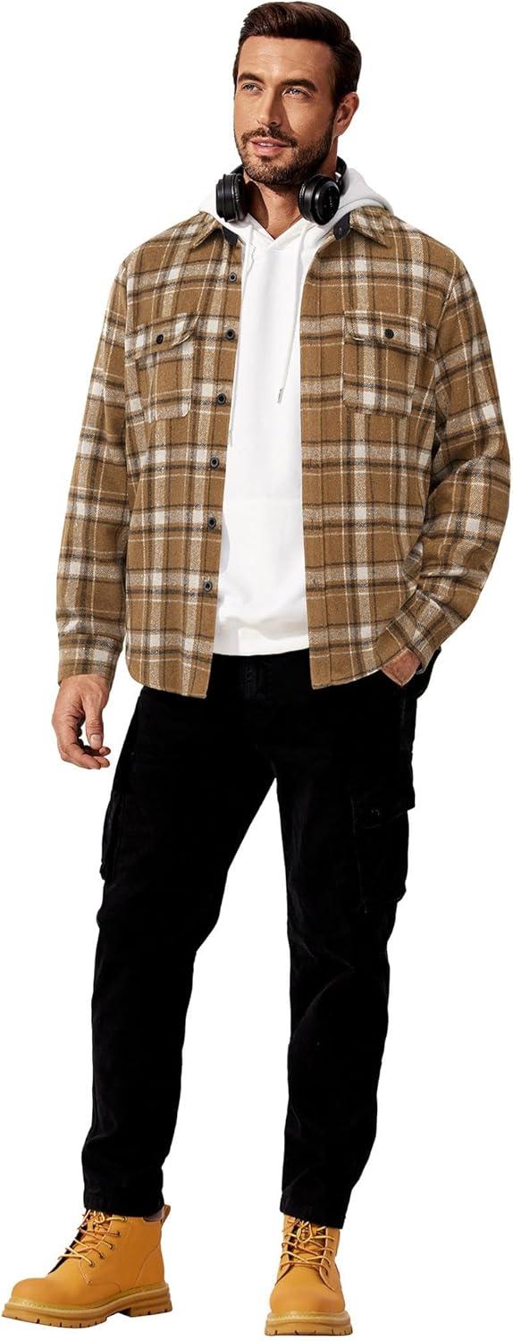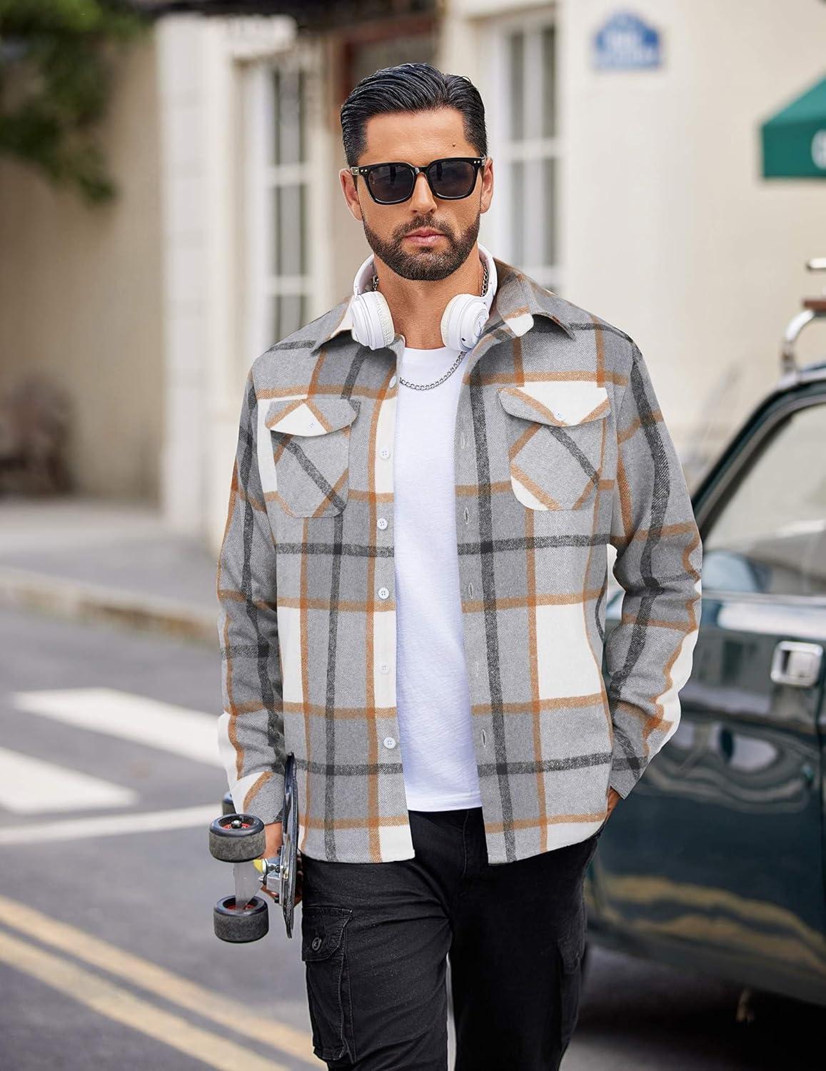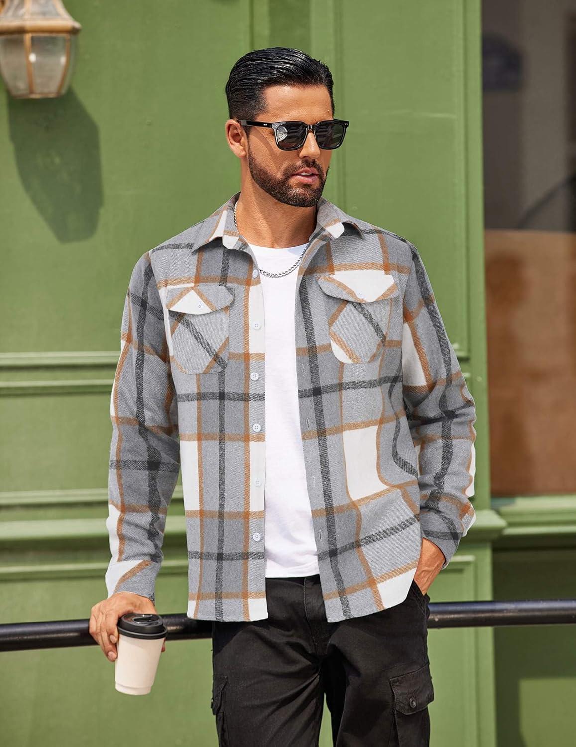 • COOFANDY Men Flannel Shirt Casual Button Down Shirt Jacket Long Sleeve Plaid Shirts with Pockets(Grey Brown)