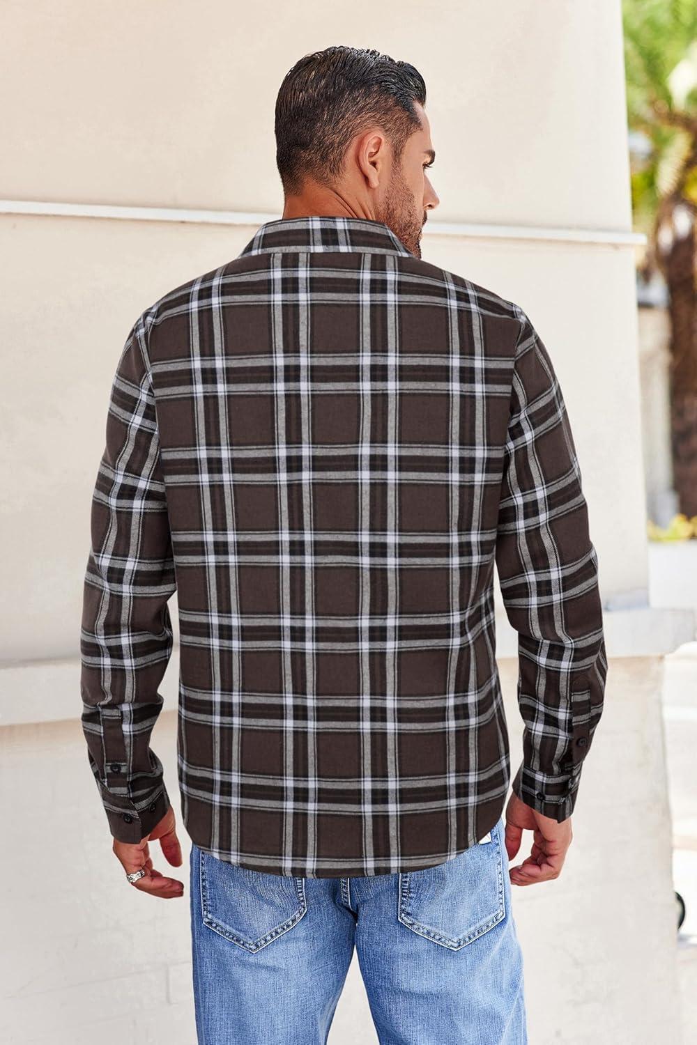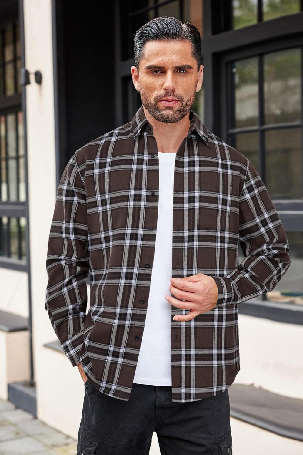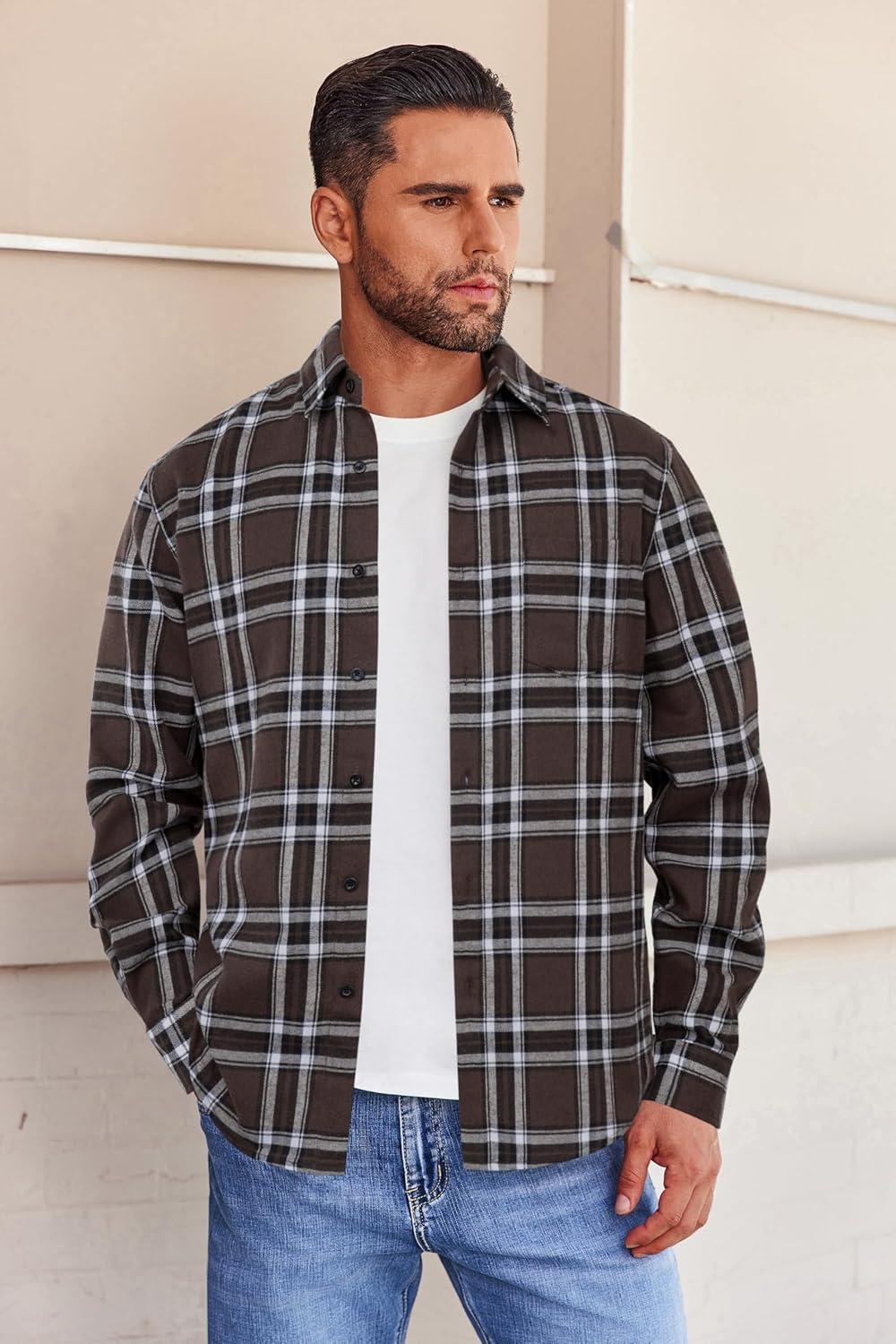 • COOFANDY Mens Flannel Shirts Long Sleeve Button Down Shirt with Pocket Casual Shirts Work Shirts for Men(Brown Black White Plaid)
