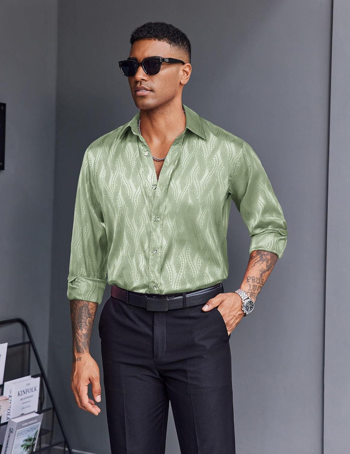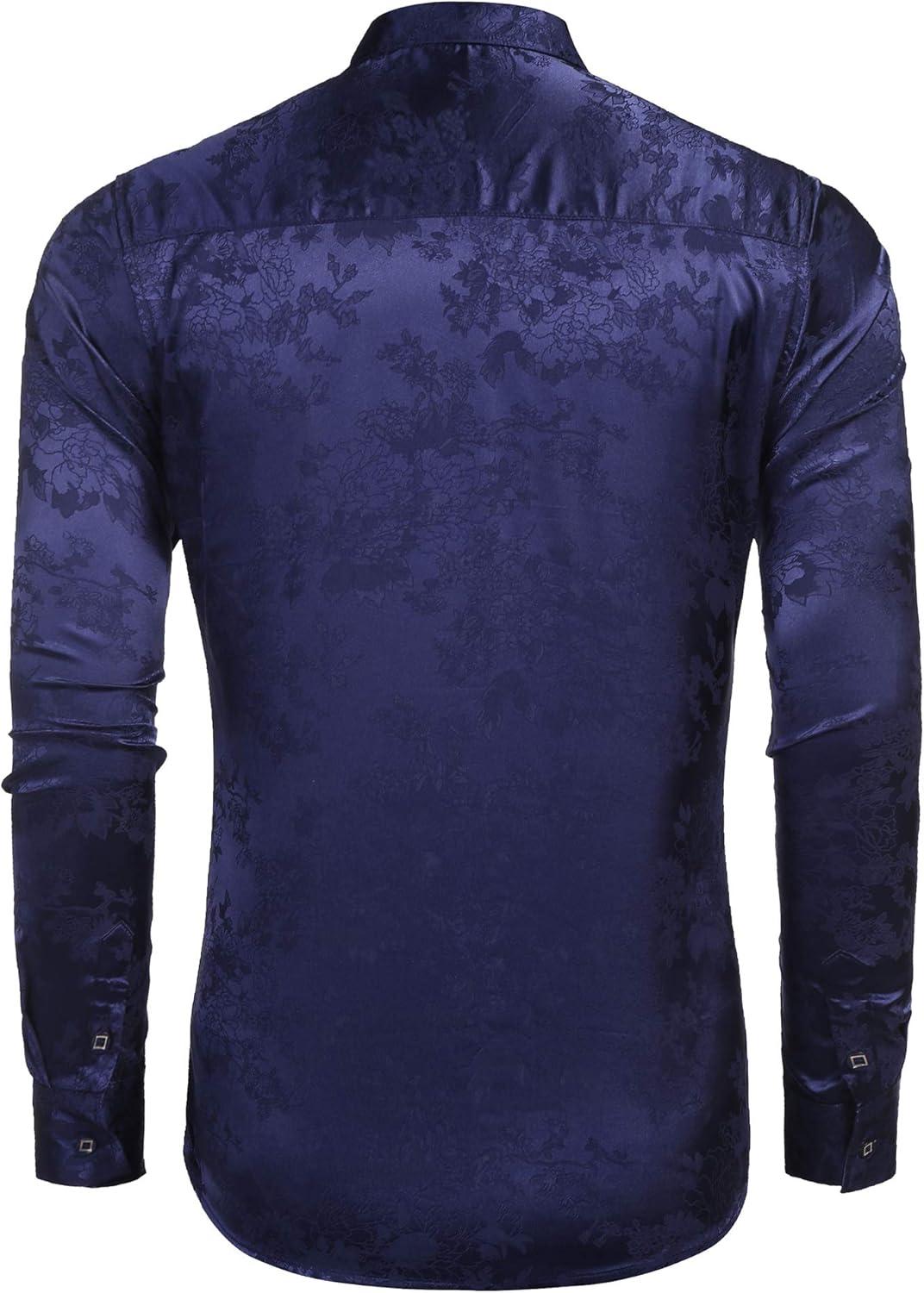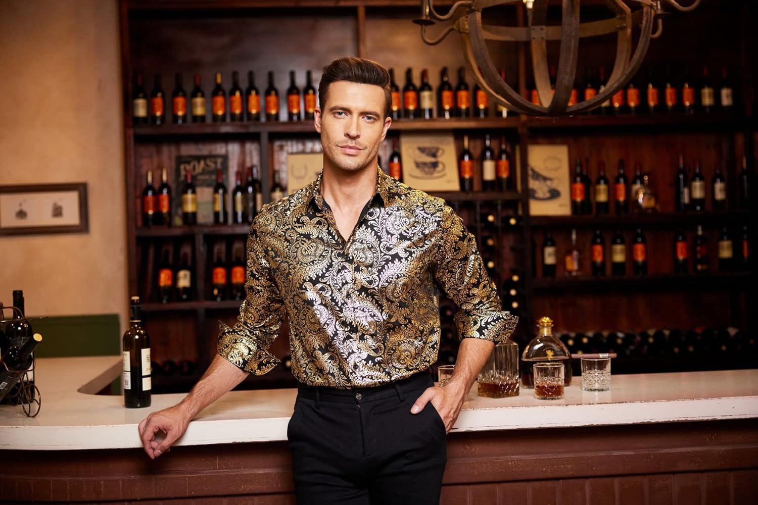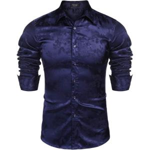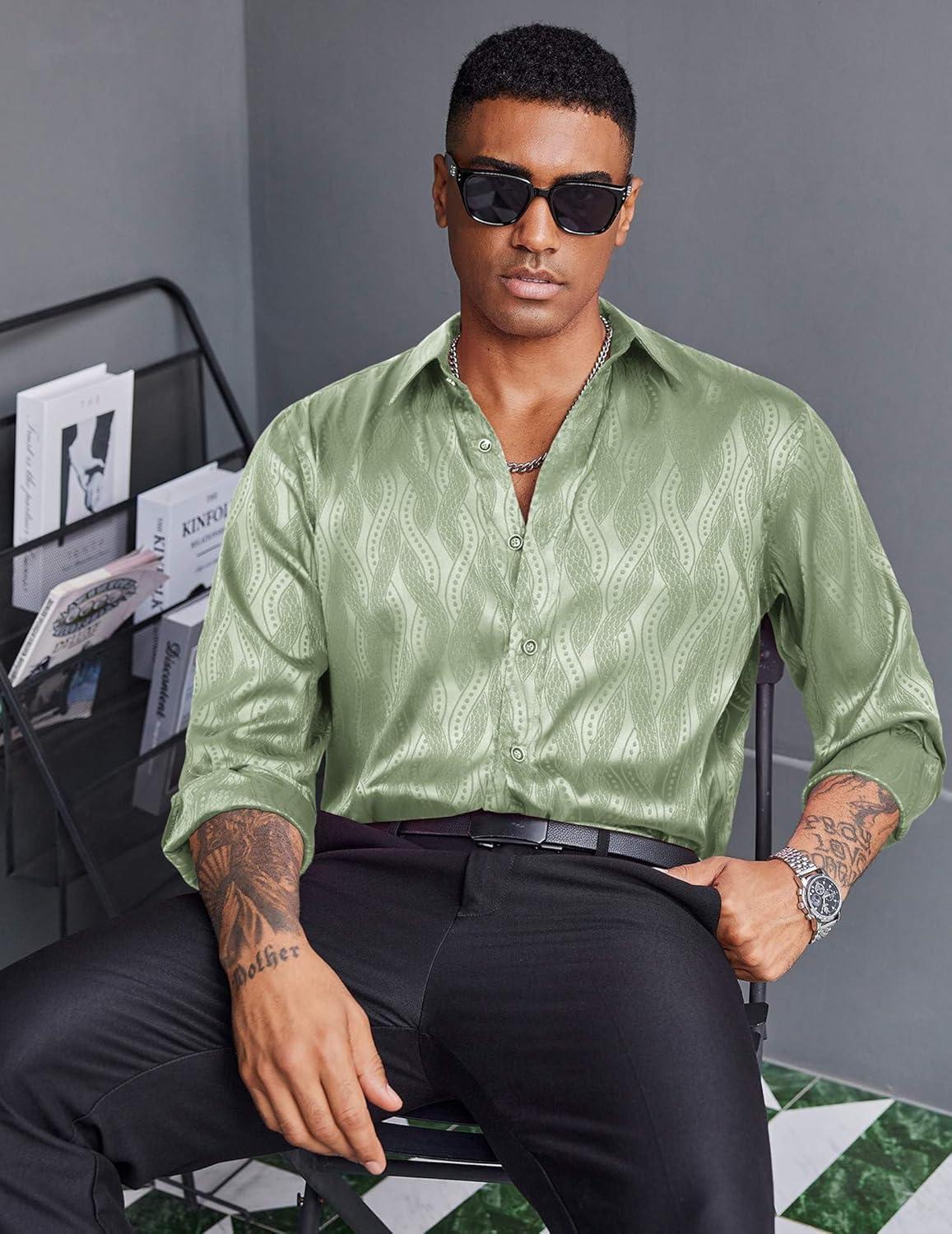 • COOFANDY Men’s Silk Satin Dress Shirts Jacquard Long Sleeve Floral Button Up Shirts Party Prom Wedding Shirt(02-gold)