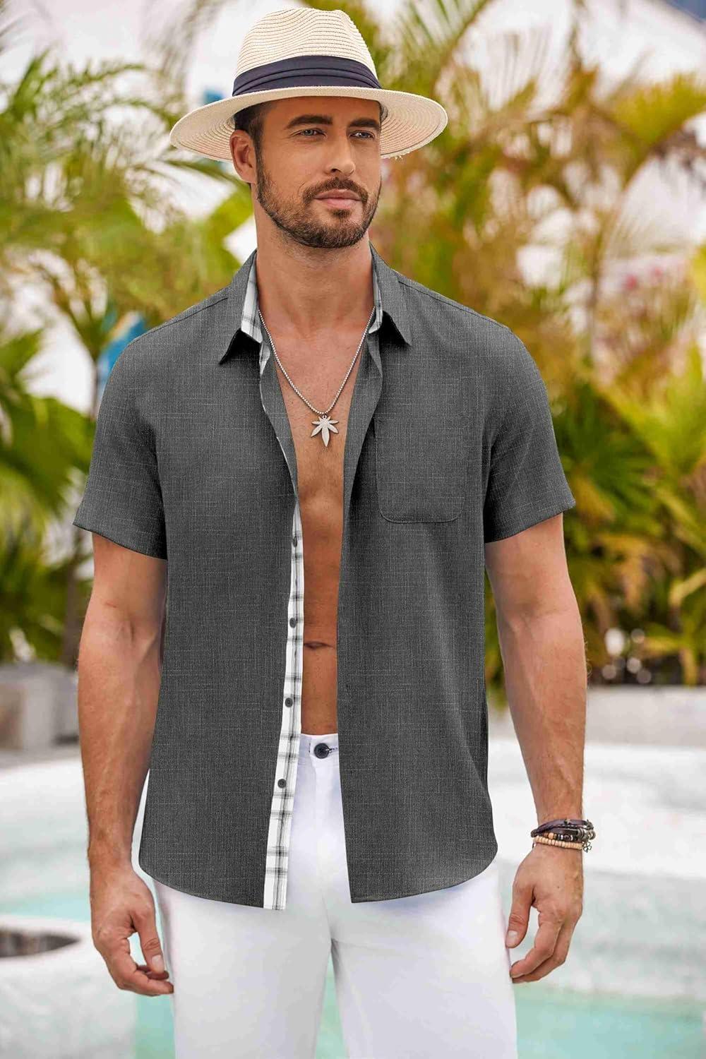 COOFANDY Men’s Button Down Shirts Short Sleeve Casual Shirts Summer Beach Shirts Vacation Wedding Shirts with Pocket(Deep Grey)