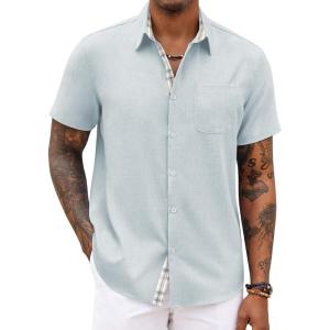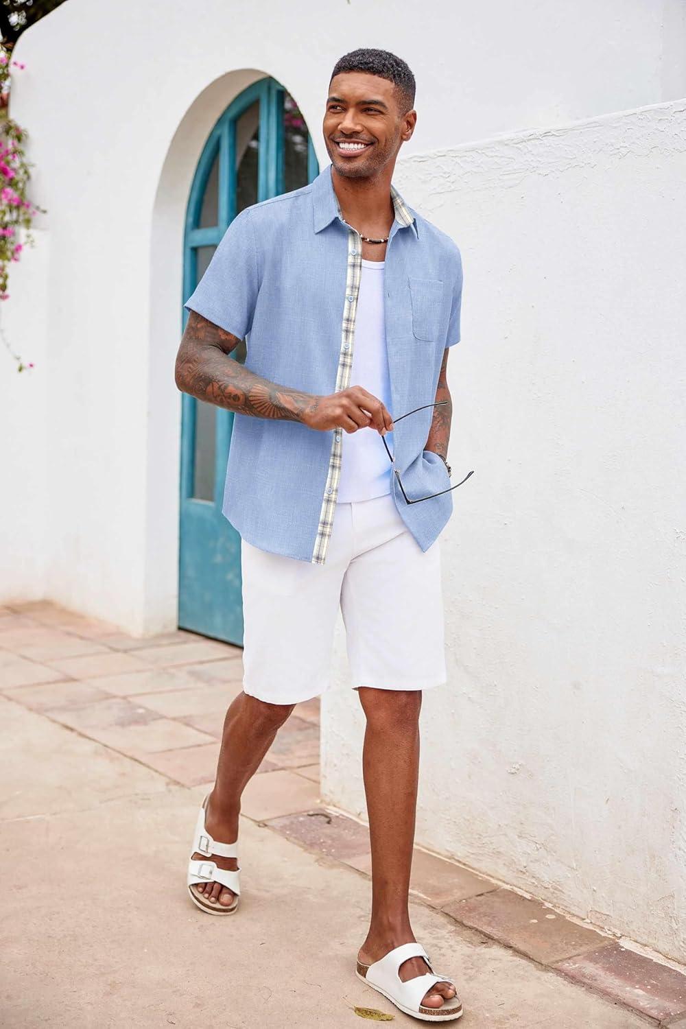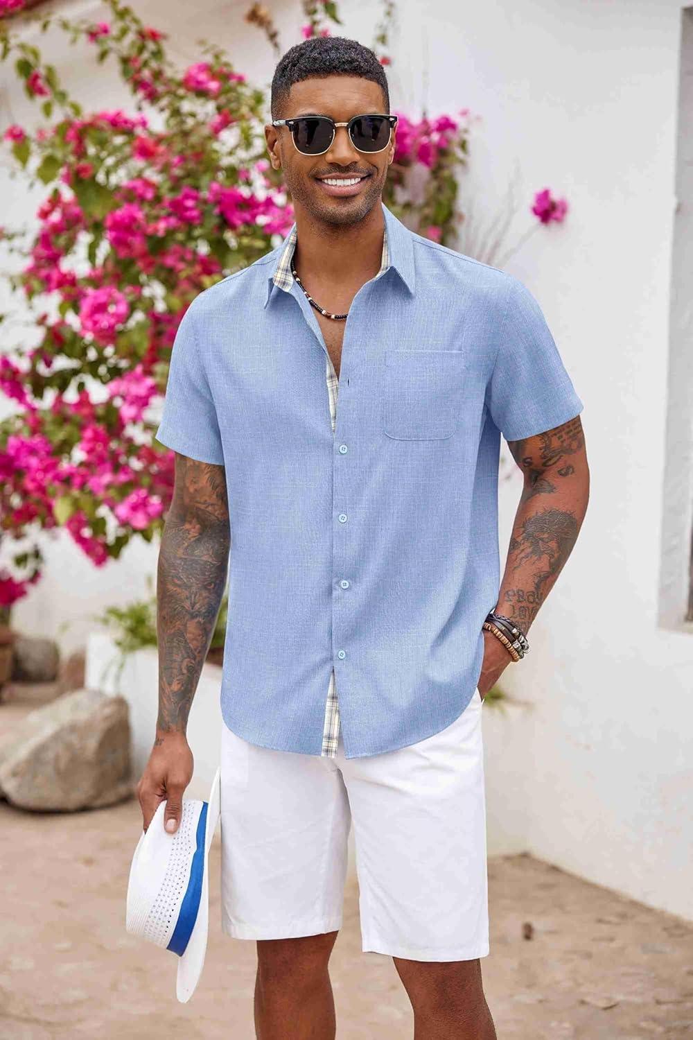 COOFANDY Men’s Button Down Shirts Short Sleeve Casual Shirts Summer Beach Shirts Vacation Wedding Shirts with Pocket(Light Denim Blue)