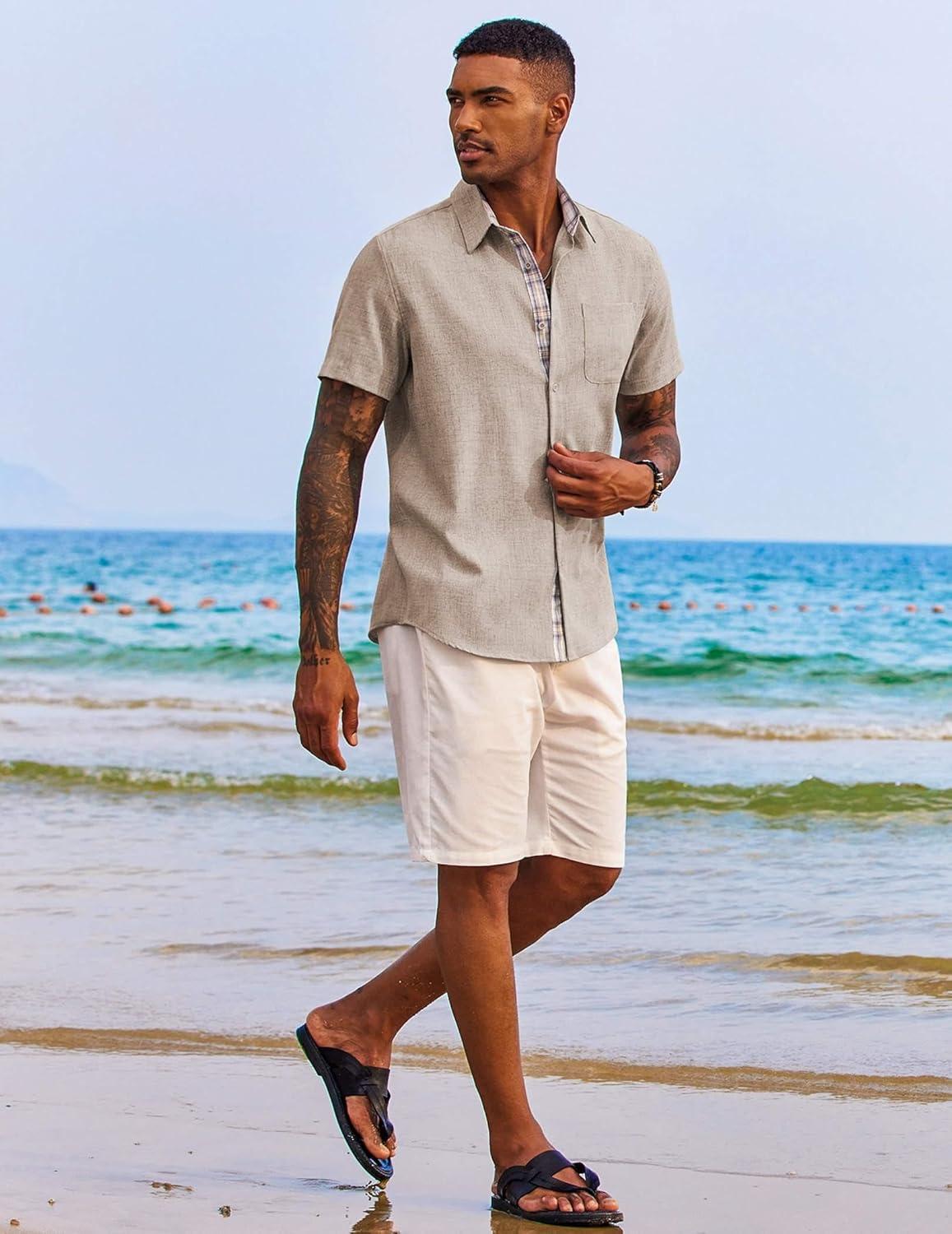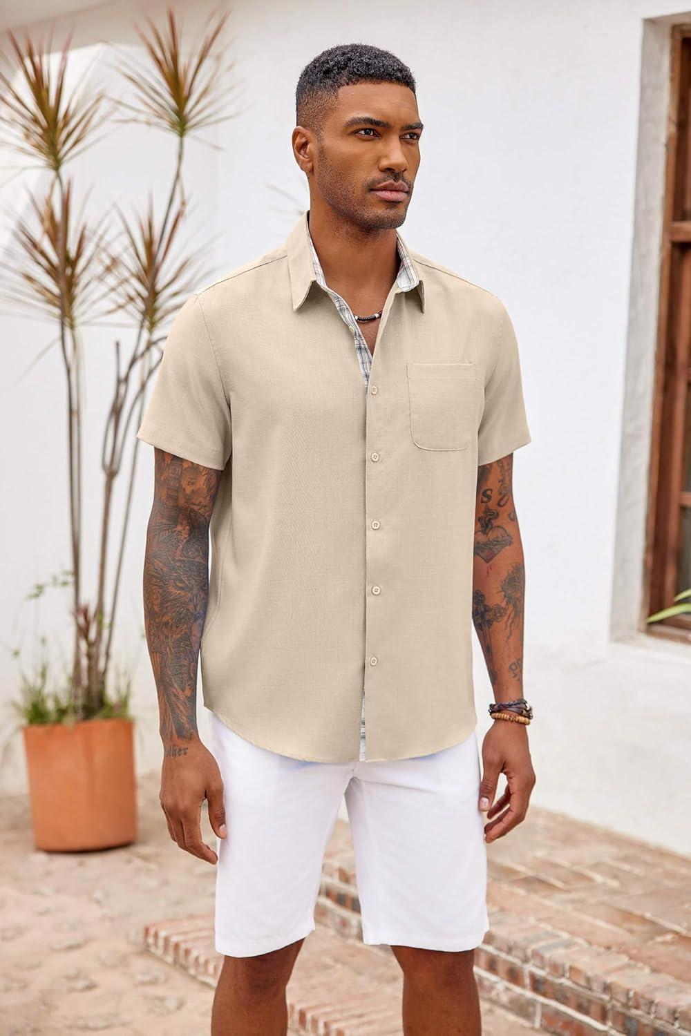 COOFANDY Men’s Button Down Shirts Short Sleeve Casual Shirts Summer Beach Shirts Vacation Wedding Shirts with Pocket(Light Khaki)