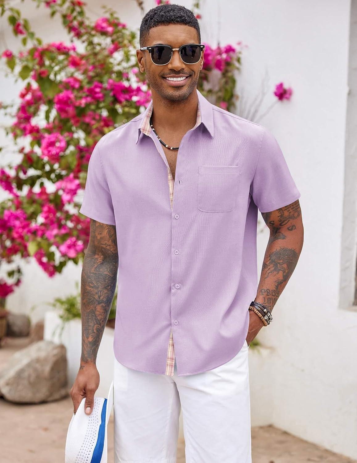 COOFANDY Men’s Button Down Shirts Short Sleeve Casual Shirts Summer Beach Shirts Vacation Wedding Shirts with Pocket(Light Purple)