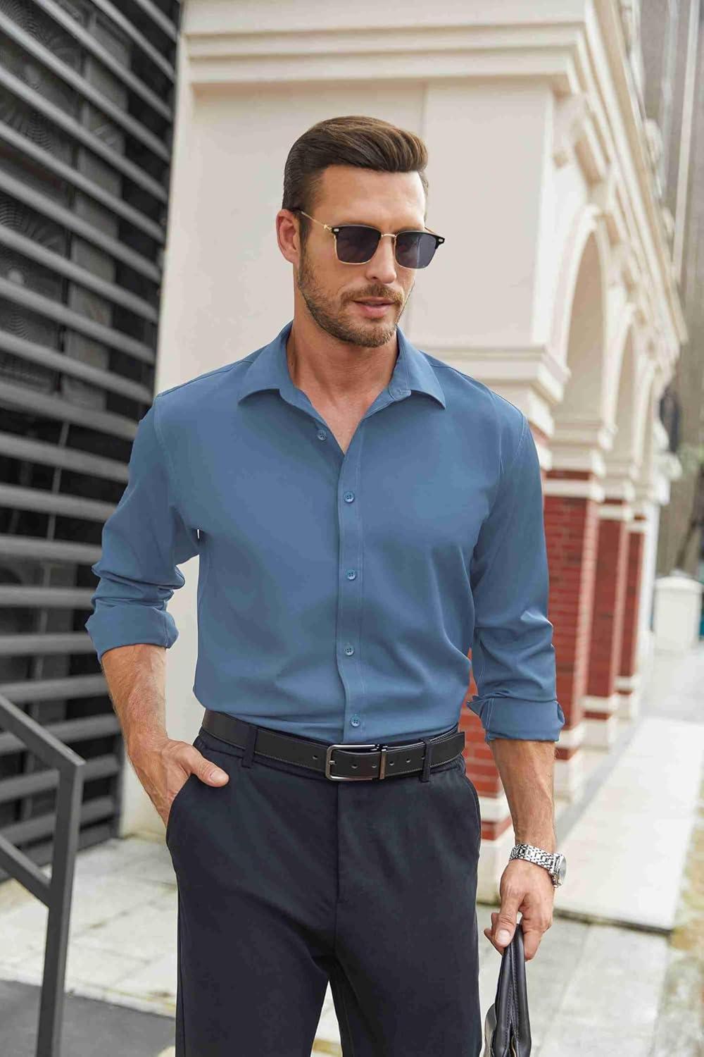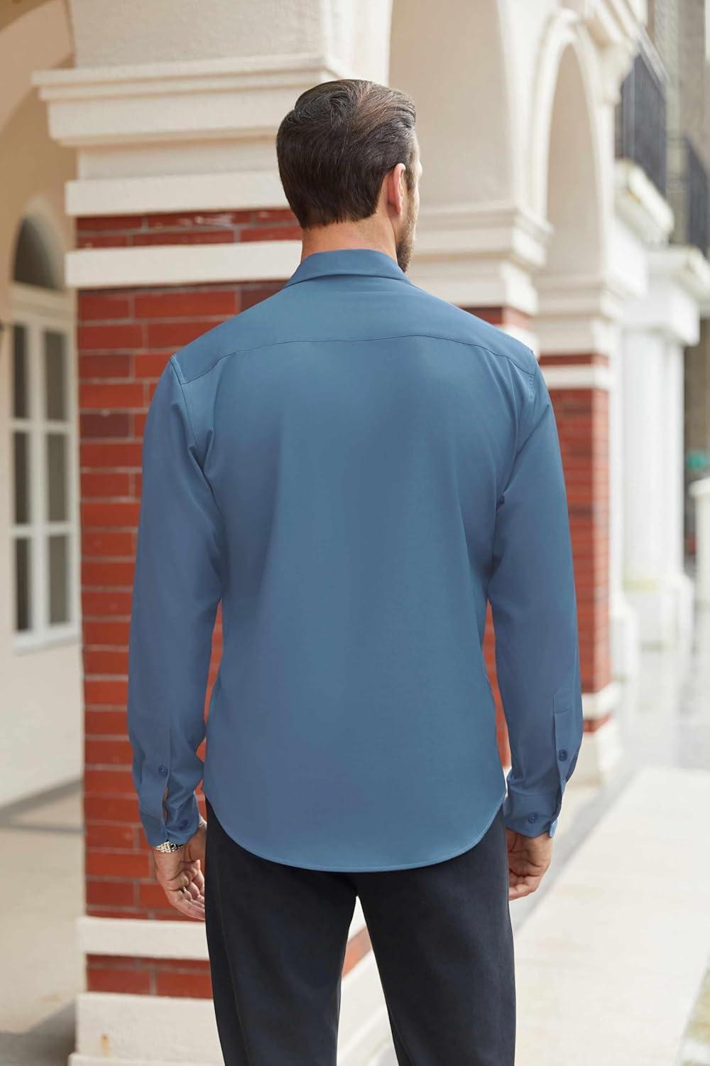 COOFANDY Mens Stretch Dress Shirts Long Sleeve Button Down Shirt Regular Fit Formal Business Shirts(Steel Blue)