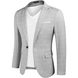 COOFANDY Men’s Blazer Casual Sport Coats Slim Fit One Button Suit Jacket Lightweight Sports Jacket(Plaid Blazer- Light Grey)