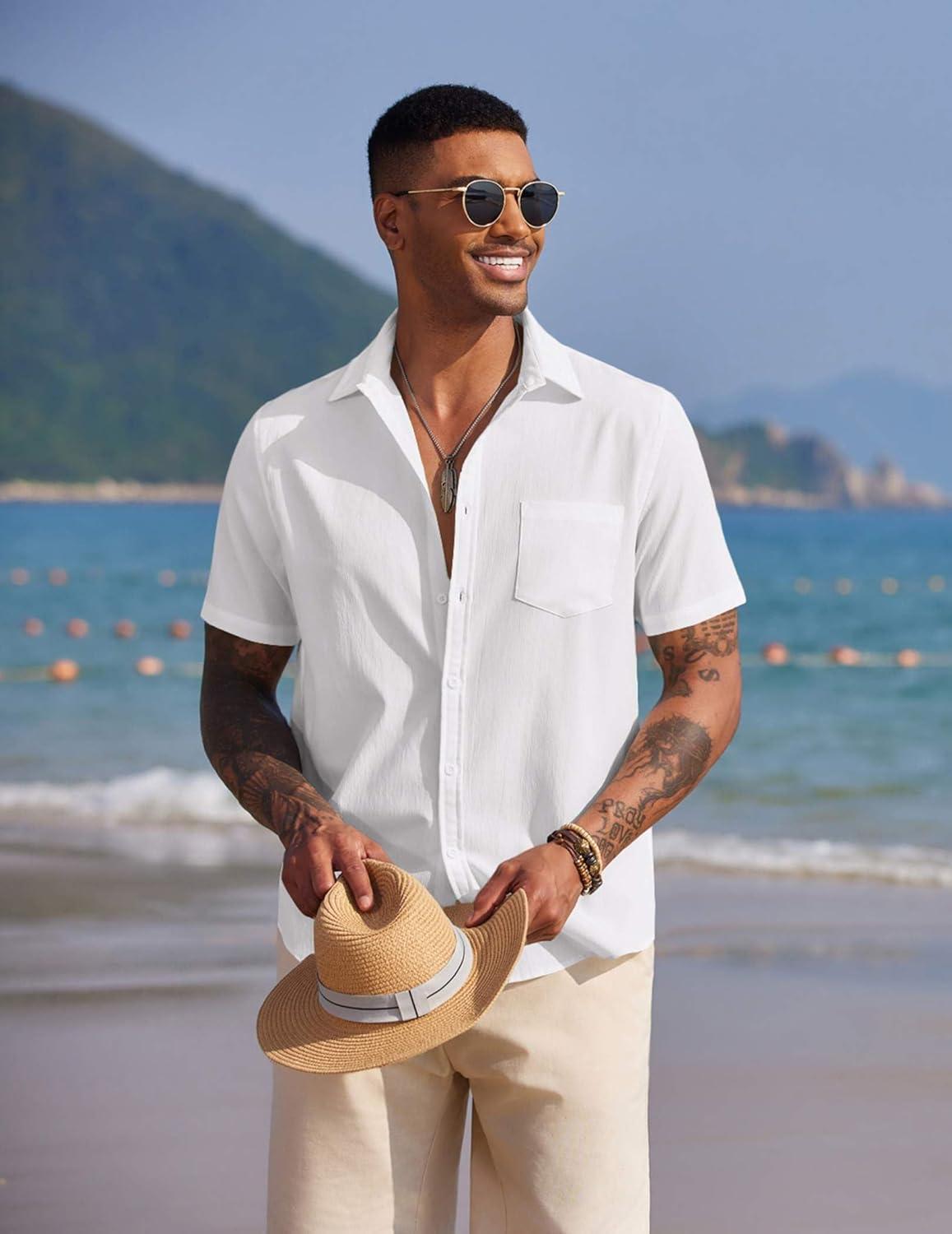 COOFANDY Button Down Short Sleeve Summer Casual Beach Shirts Shirt(White)