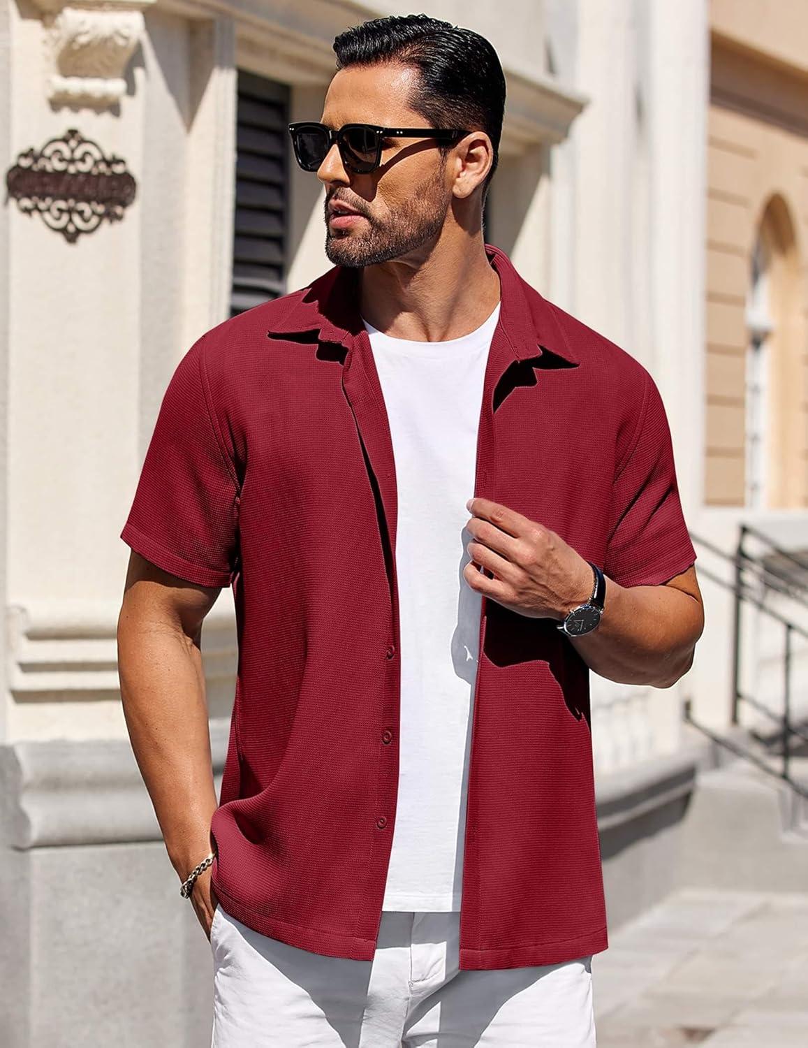 COOFANDY Button Down Short Sleeve Summer Casual Beach Shirts Shirt(Wine Red)