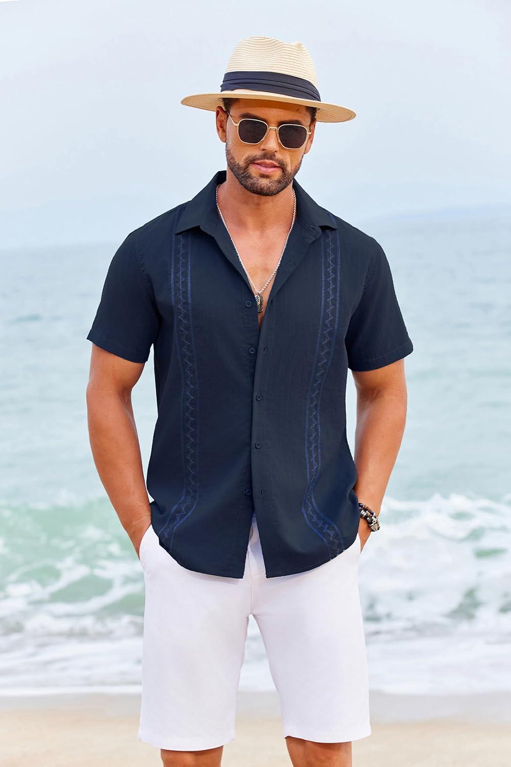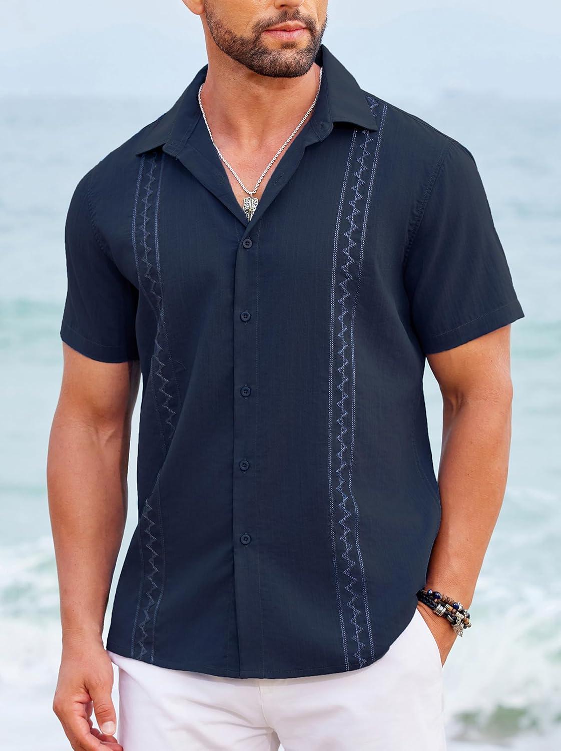 COOFANDY Cuban Guayabera Shirts for Men Short Sleeve Casual Button Down Shirts Summer Vacation Shirts(Dark Navy)