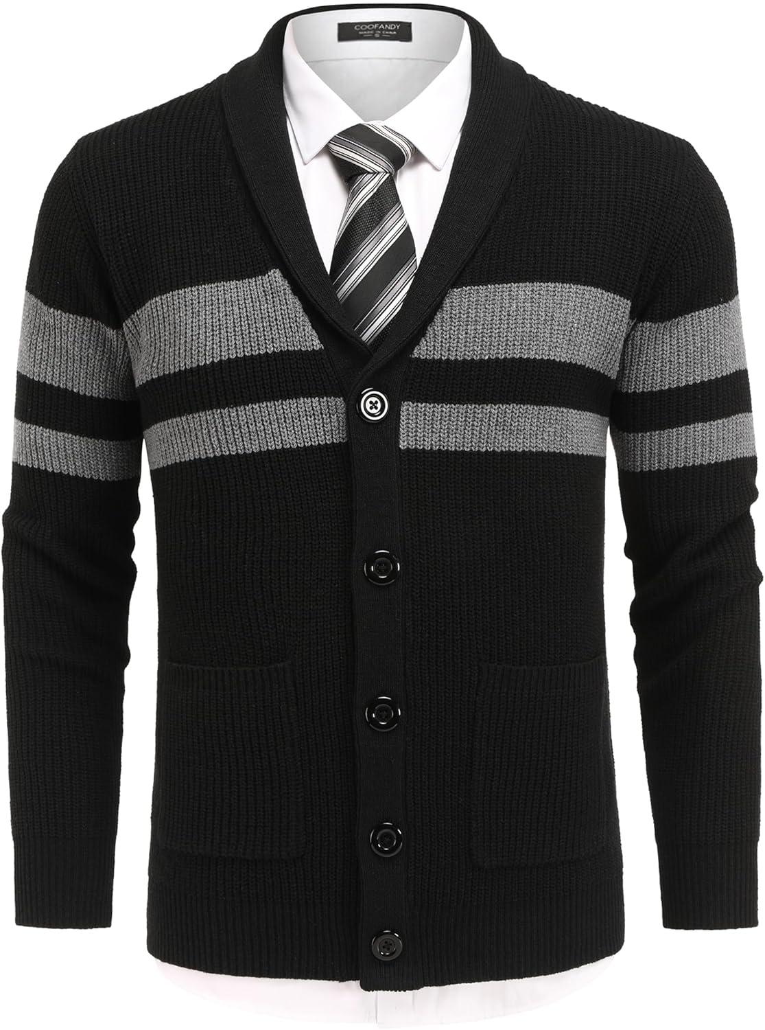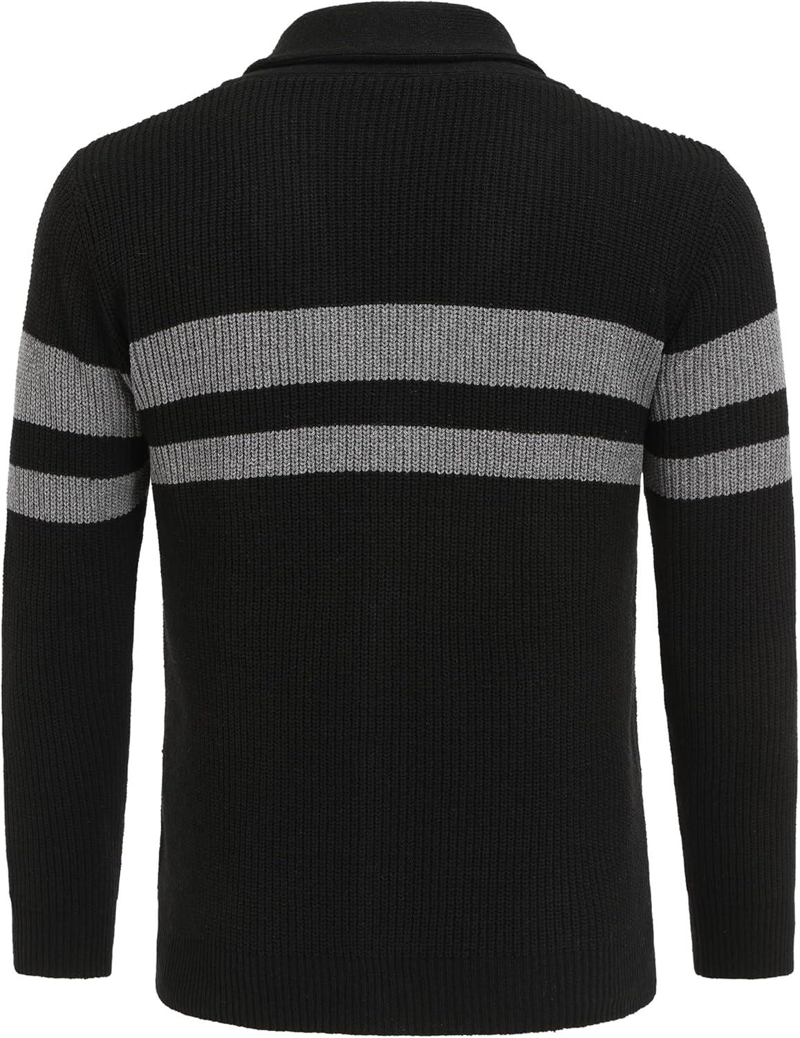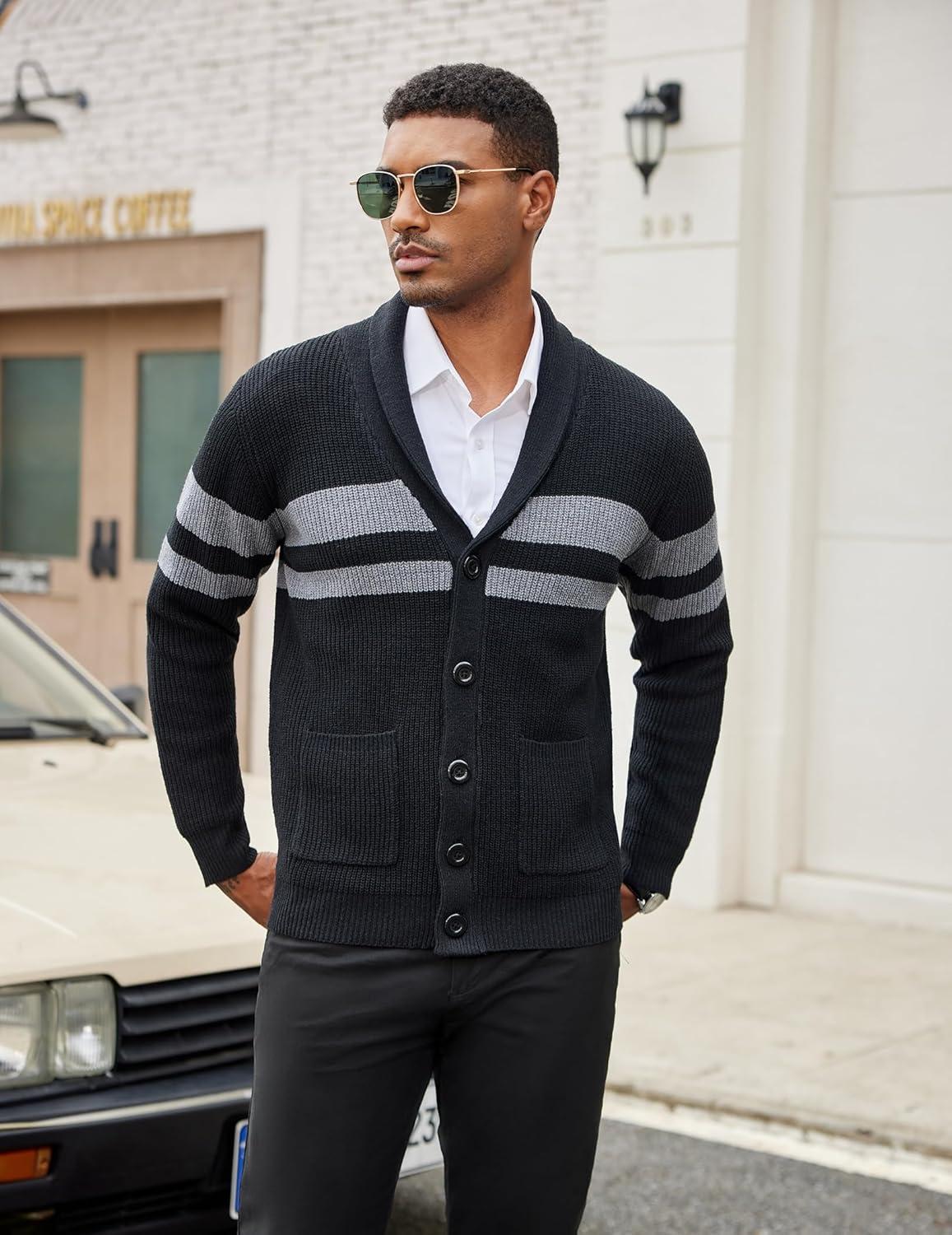 COOFANDY Men’s Shawl Collar Cardigan Sweater Slim Fit Cable Knit Button up Sweater with Pockets(Stripes-dark Gray on Black)