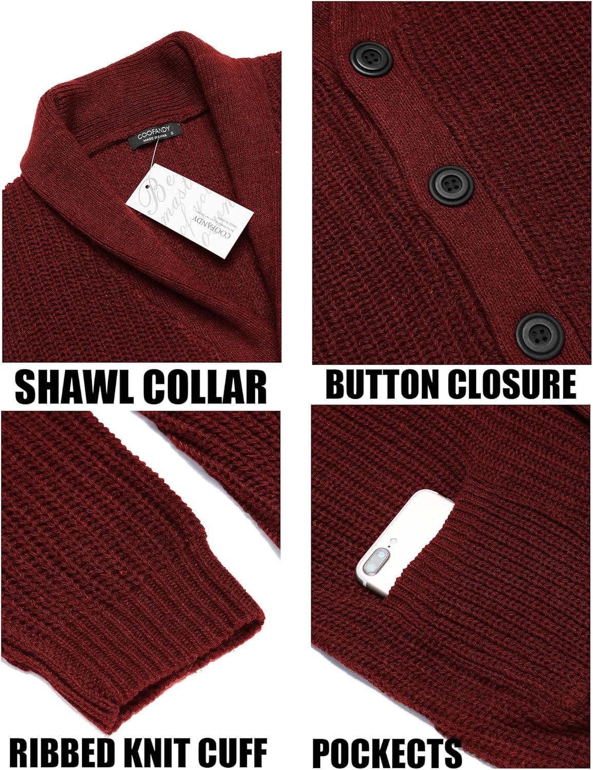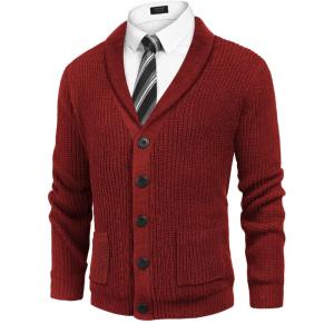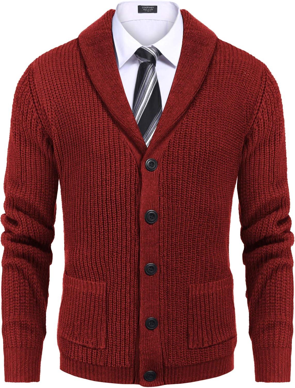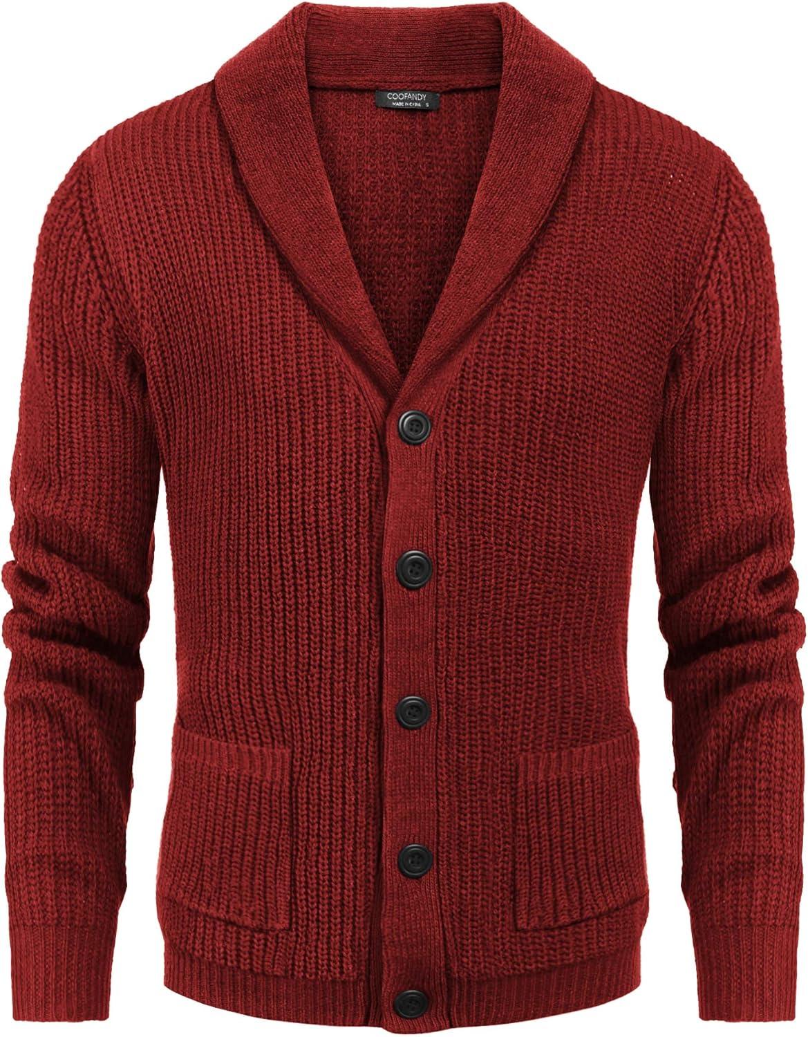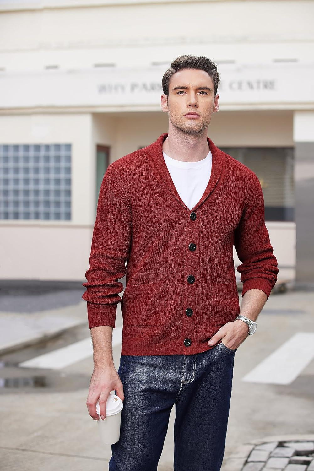 COOFANDY Men’s Shawl Collar Cardigan Sweater Slim Fit Cable Knit Button up Sweater with Pockets(Wine Red)