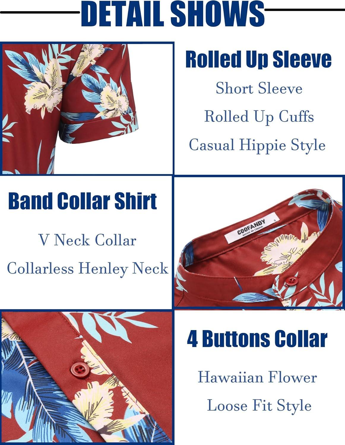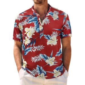 COOFANDY Men’s Casual Henley Shirt Band Collar Short Sleeve Shirt Summer Beach Hippie T-Shirt(Flower Leaves – Red Blue Apricot)