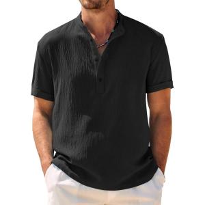 COOFANDY Men’s Casual Henley Shirt Band Collar Short Sleeve Shirt Summer Beach Hippie T-Shirt(Black)