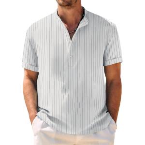 COOFANDY Men’s Casual Henley Shirt Band Collar Short Sleeve Shirt Summer Beach Hippie T-Shirt(Black Stripes on White)