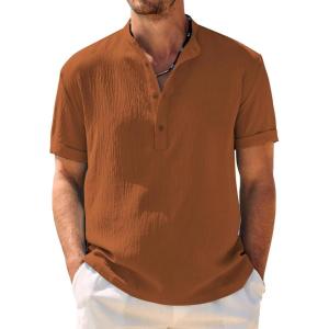 COOFANDY Men’s Casual Henley Shirt Band Collar Short Sleeve Shirt Summer Beach Hippie T-Shirt(Caramel)