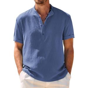 COOFANDY Men’s Casual Henley Shirt Band Collar Short Sleeve Shirt Summer Beach Hippie T-Shirt(Denim Blue)