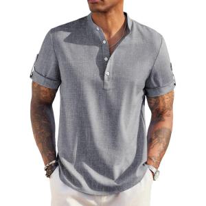 COOFANDY Men’s Casual Henley Shirt Band Collar Short Sleeve Shirt Summer Beach Hippie T-Shirt(Grey)