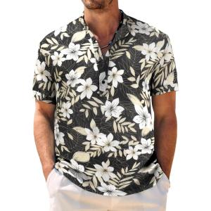 COOFANDY Men’s Casual Henley Shirt Band Collar Short Sleeve Shirt Summer Beach Hippie T-Shirt(Green White Leaves)