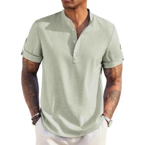 COOFANDY Men’s Casual Henley Shirt Band Collar Short Sleeve Shirt Summer Beach Hippie T-Shirt(Light Green)