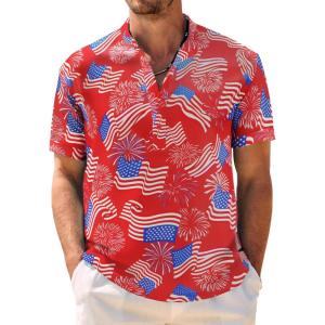 COOFANDY Men’s Casual Henley Shirt Band Collar Short Sleeve Shirt Summer Beach Hippie T-Shirt(National Flag Fireworks – Red White Blue)