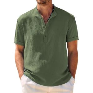 COOFANDY Men’s Casual Henley Shirt Band Collar Short Sleeve Shirt Summer Beach Hippie T-Shirt(Olive Green)