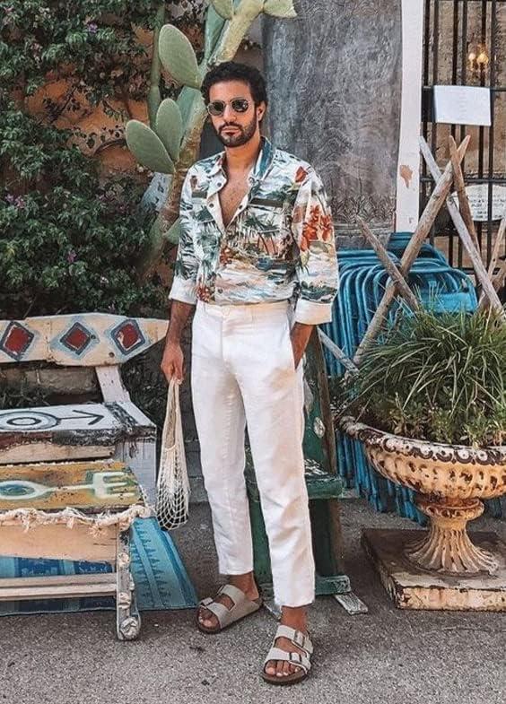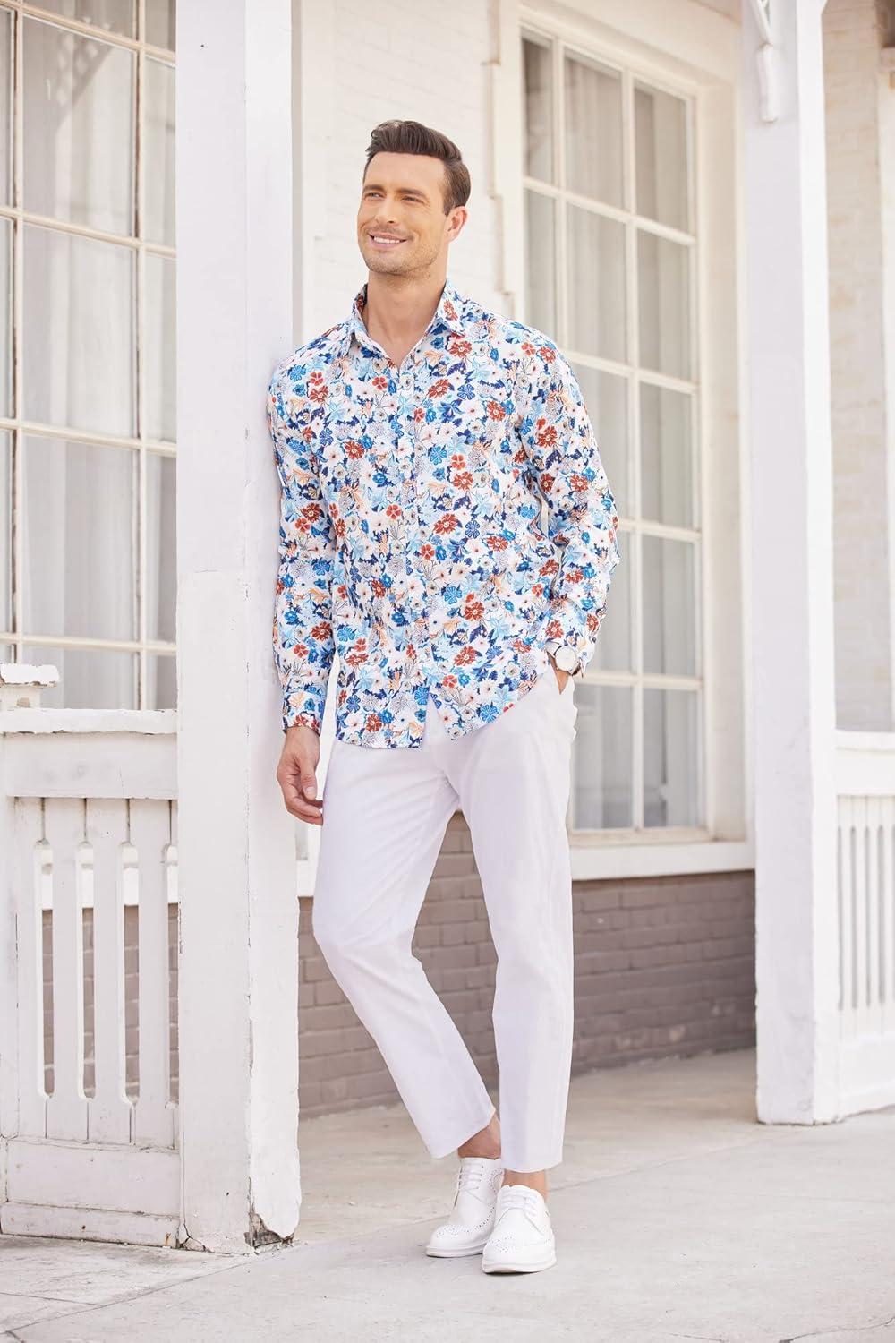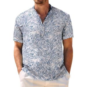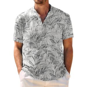 COOFANDY Men’s Casual Henley Shirt Band Collar Short Sleeve Shirt Summer Beach Hippie T-Shirt(White and Blue Plant Leaves)