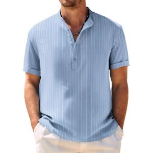 COOFANDY Men’s Casual Henley Shirt Band Collar Short Sleeve Shirt Summer Beach Hippie T-Shirt(Striped Blue)