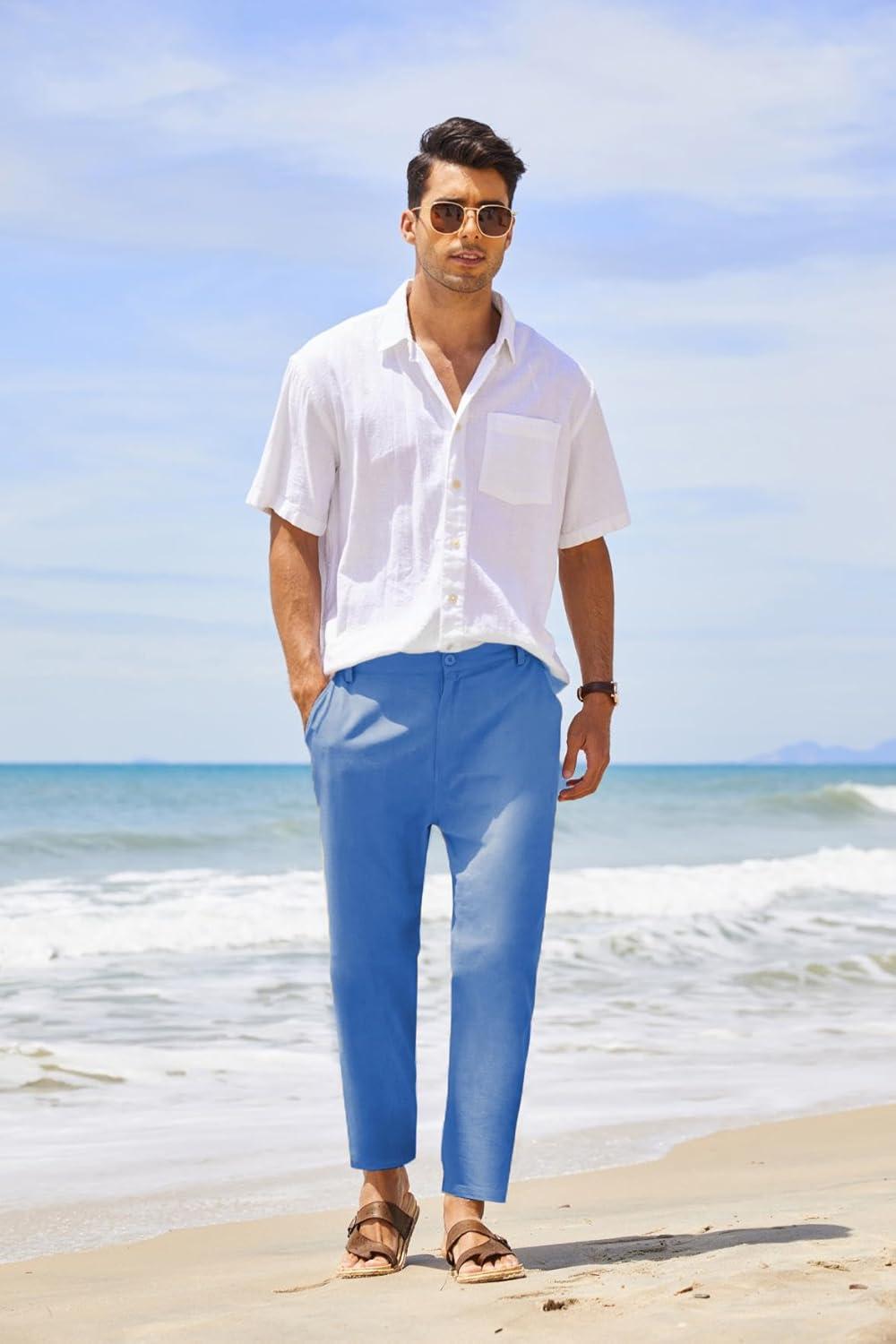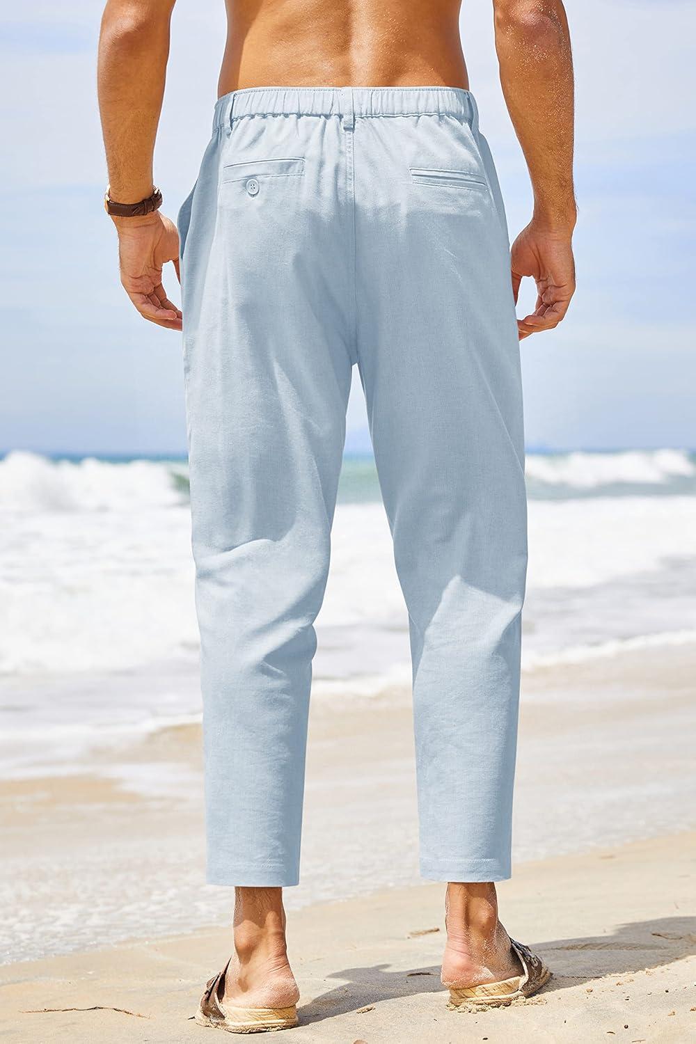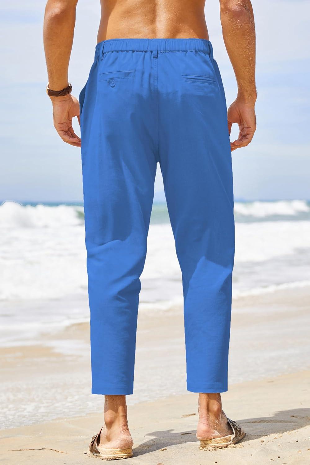 COOFANDY Men’s Cotton Linen Pants Elastic Waist Lightweight Casual Pants Relaxed Fit Yoga Beach Pants with Pockets(02-blue)