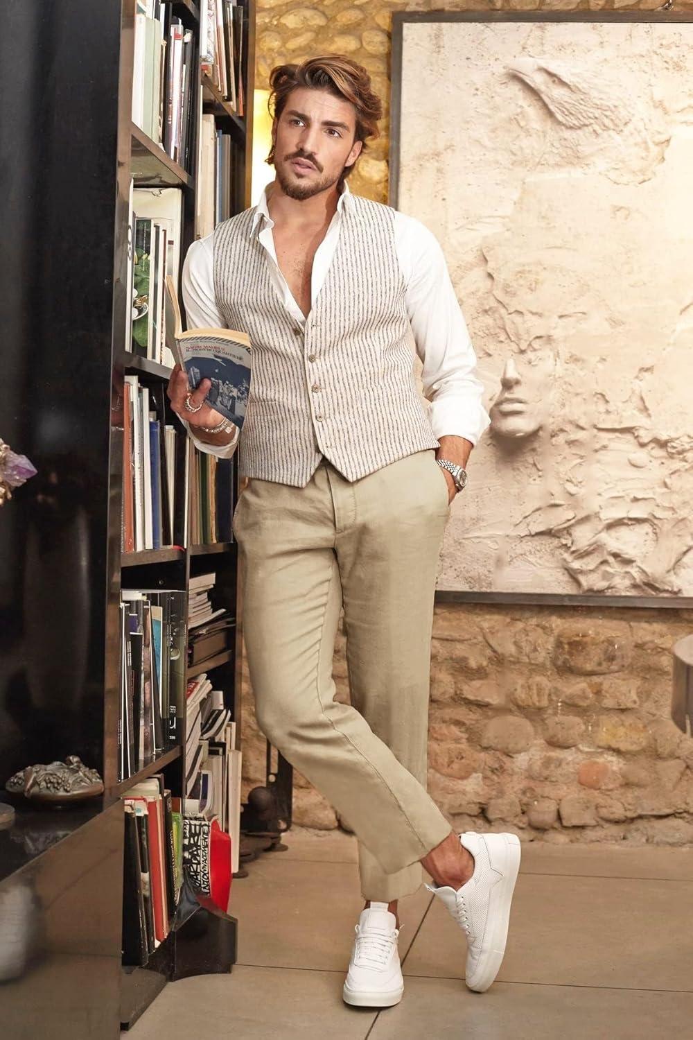 COOFANDY Men’s Cotton Linen Pants Elastic Waist Lightweight Casual Pants Relaxed Fit Yoga Beach Pants with Pockets(White ( Black Stripe ))