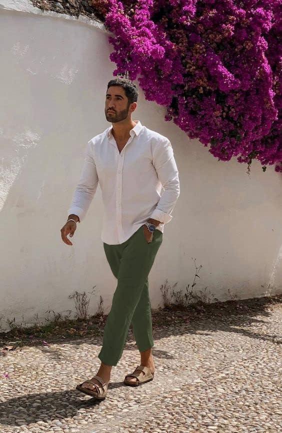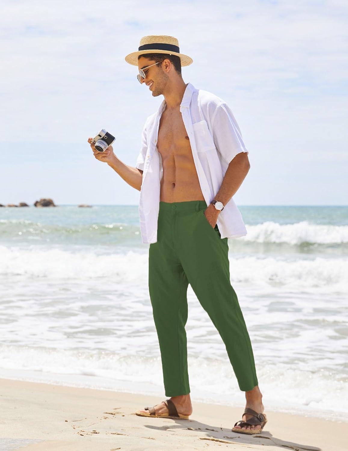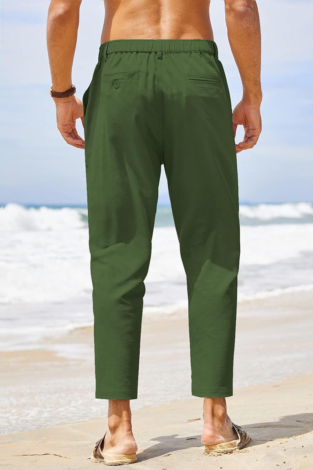 COOFANDY Men’s Cotton Linen Pants Elastic Waist Lightweight Casual Pants Relaxed Fit Yoga Beach Pants with Pockets(Army Green)