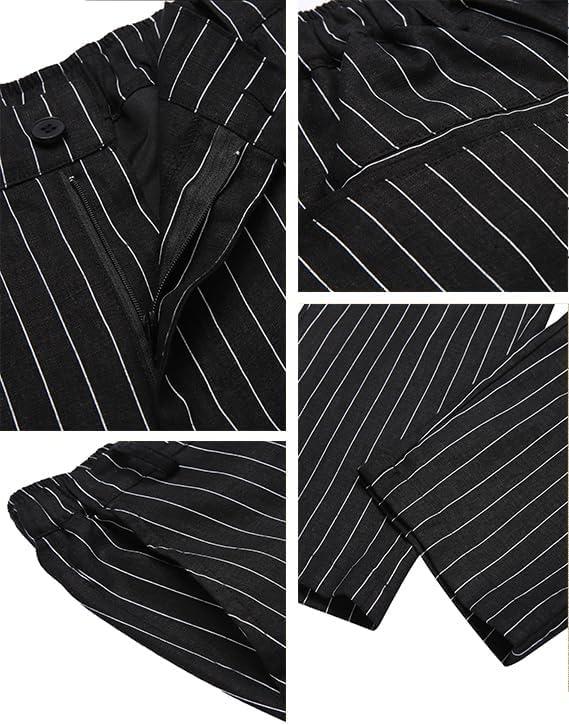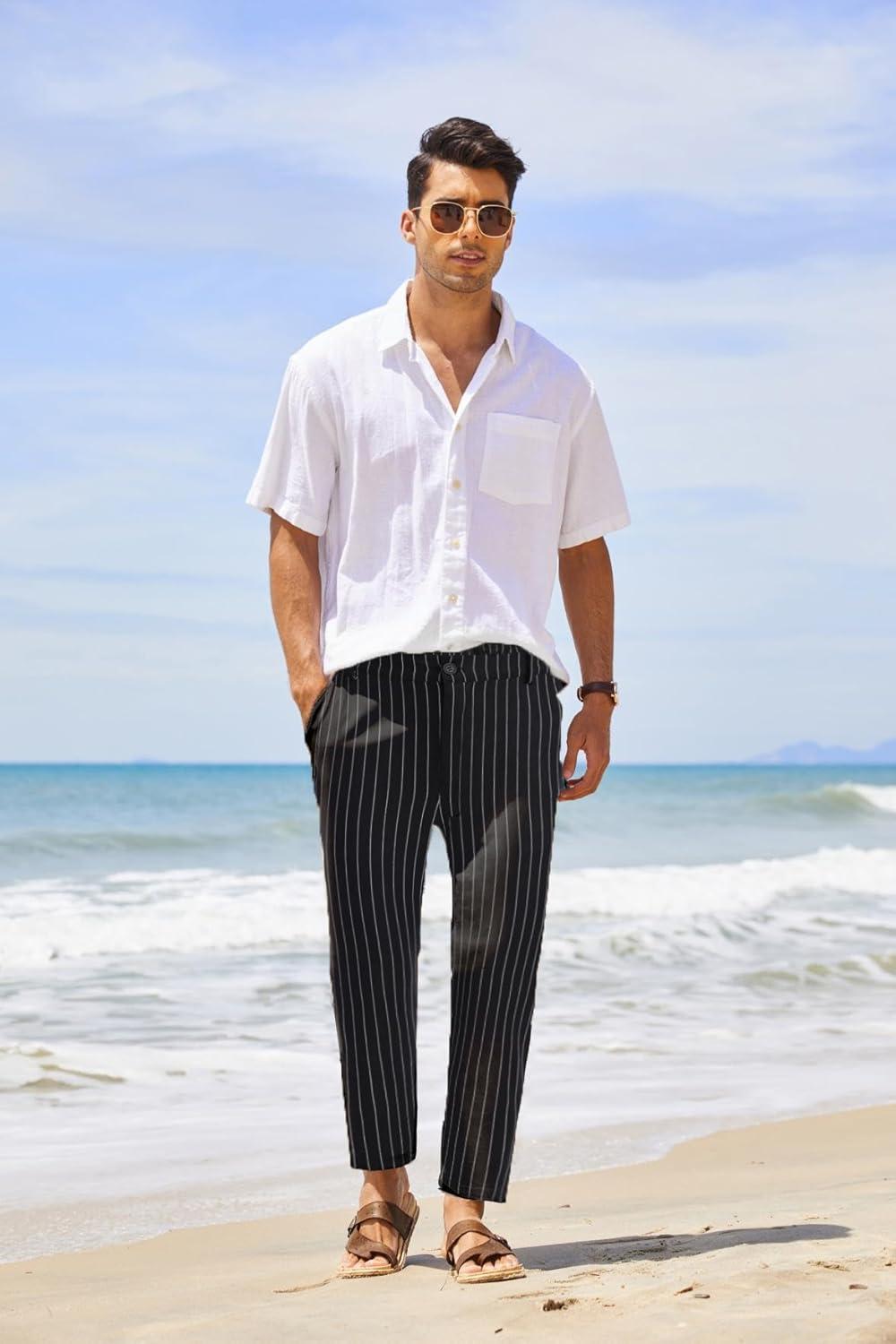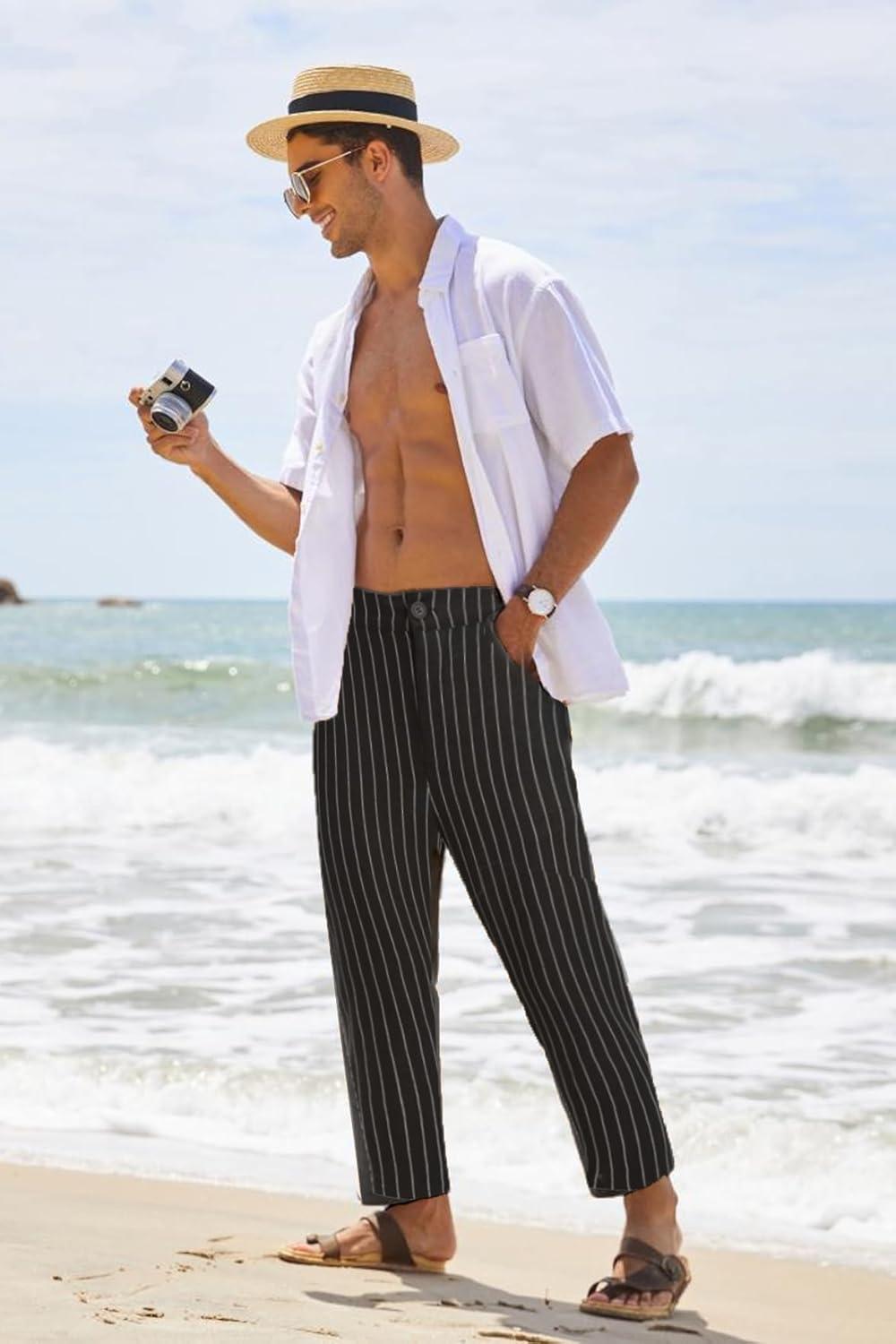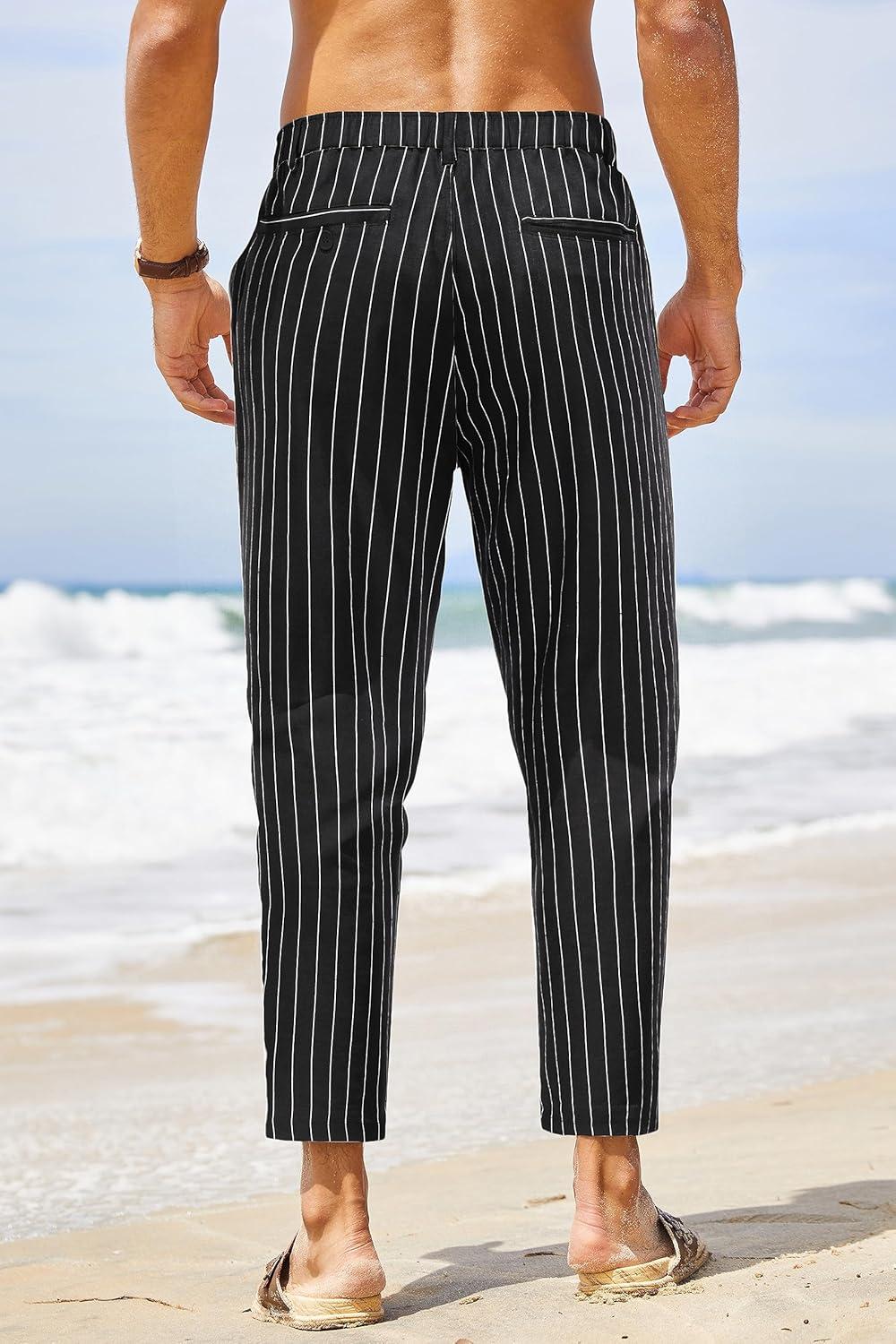 COOFANDY Men’s Cotton Linen Pants Elastic Waist Lightweight Casual Pants Relaxed Fit Yoga Beach Pants with Pockets(Black ( White Stripe ))