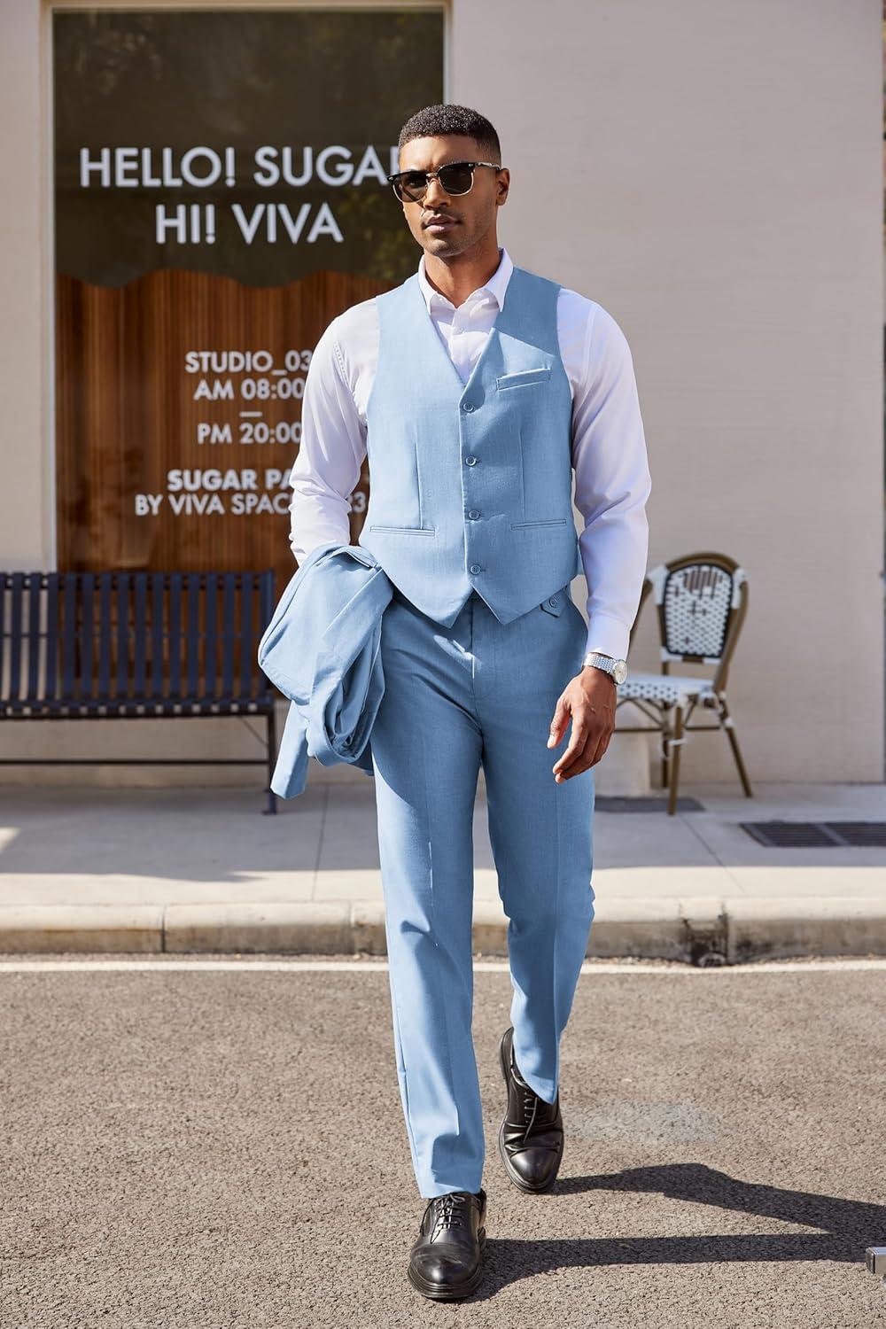 • COOFANDY Men’s 3 Pieces Suit Classic One Button Single Breasted Slim Fit Blazer Jacket Vest Pants Set Wedding Busines(Light Blue)