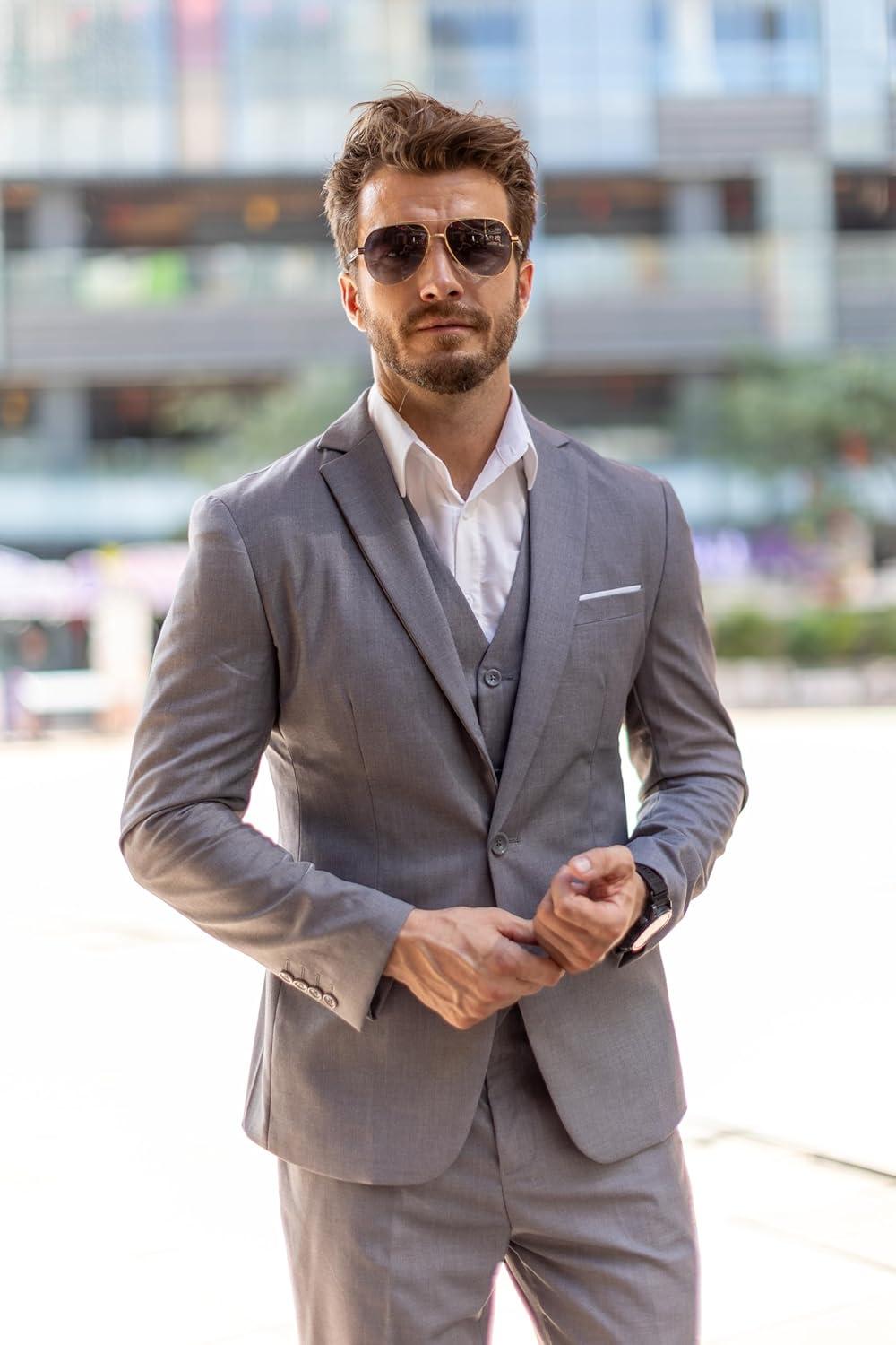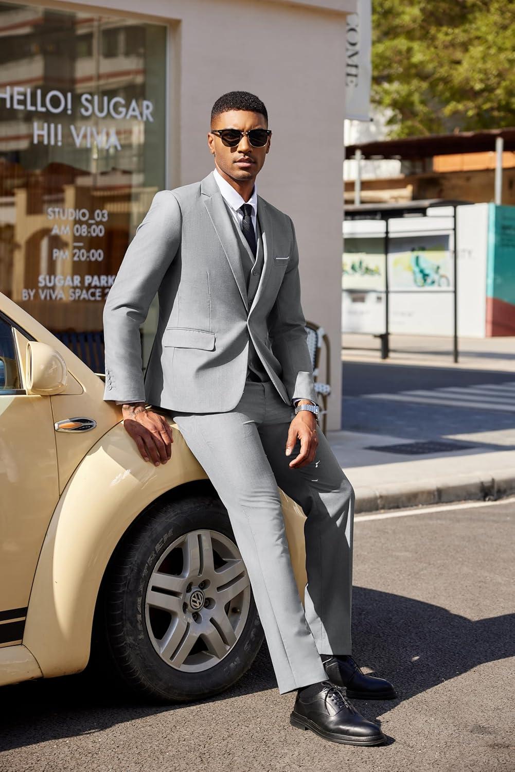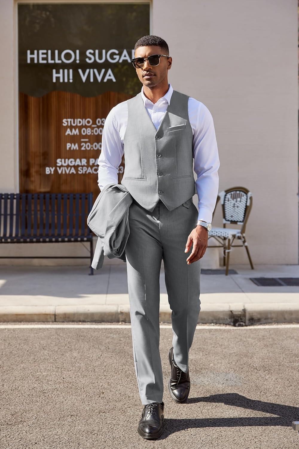 • COOFANDY Men’s 3 Pieces Suit Classic One Button Single Breasted Slim Fit Blazer Jacket Vest Pants Set Wedding Busines(Light Heather Grey)