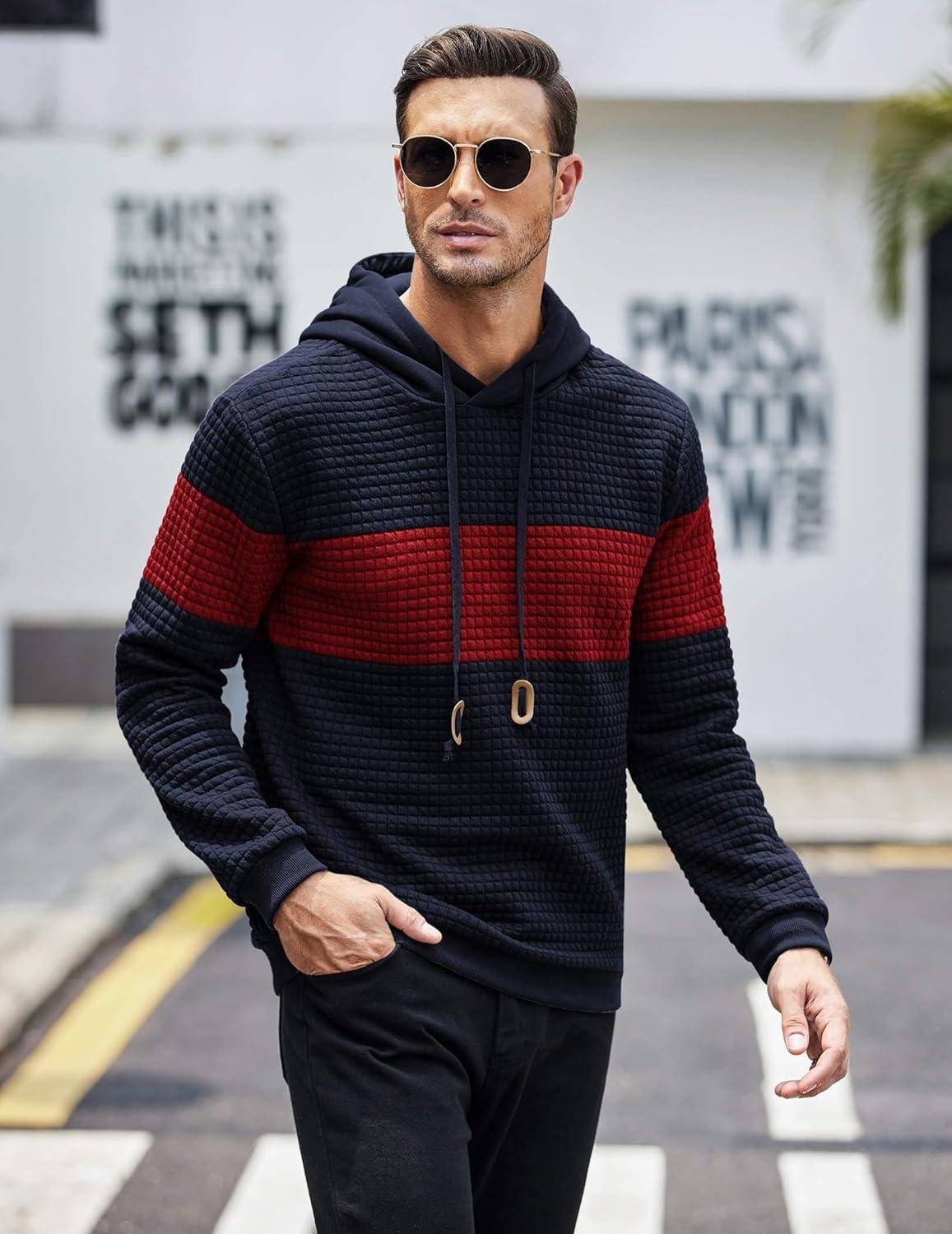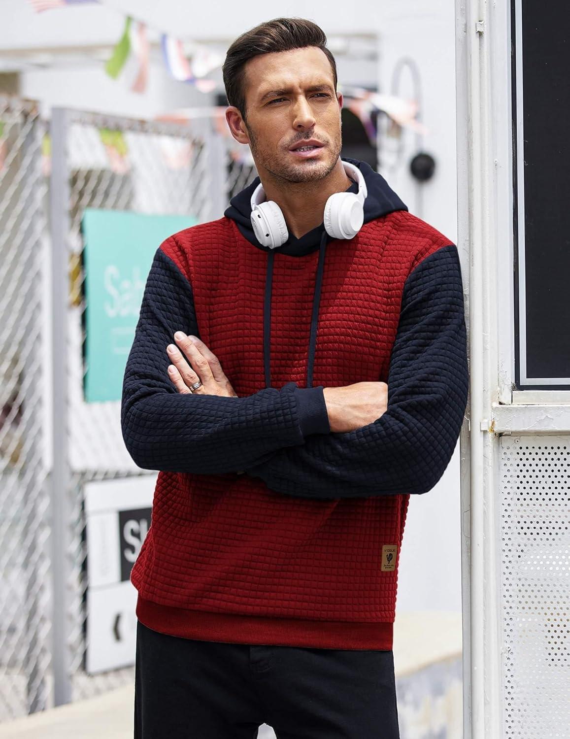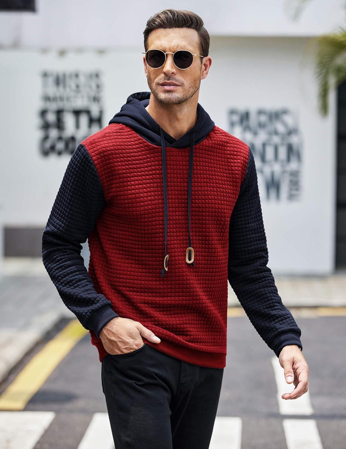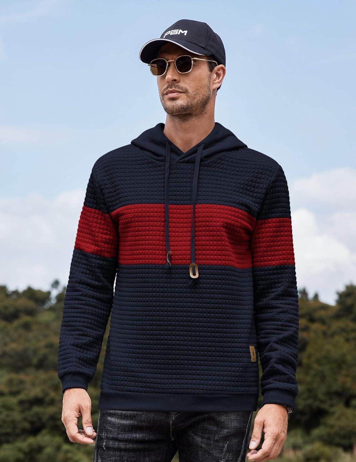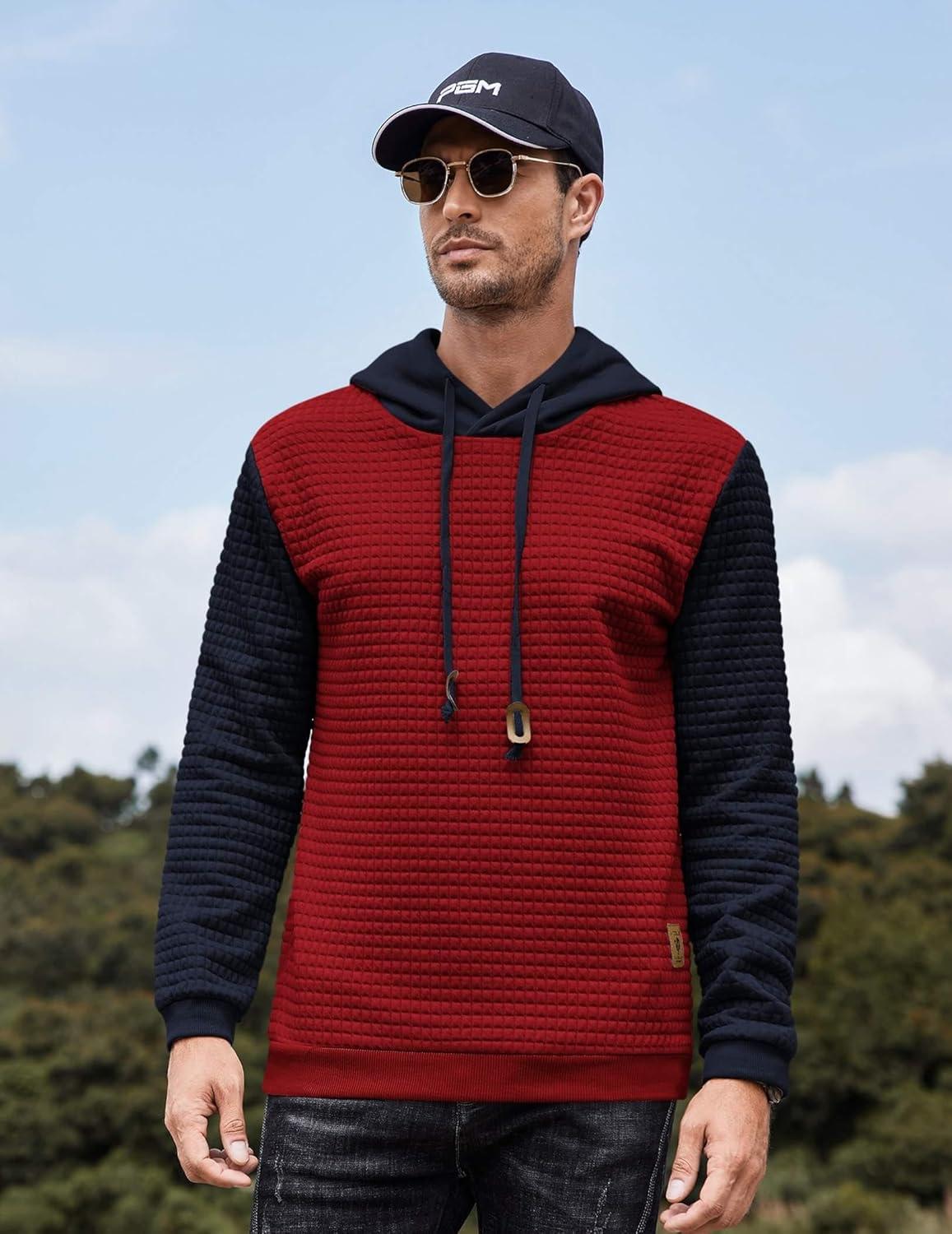 COOFANDY Mens Hooded Sweatshirt Casual Long Sleeve Drawstring Waffle Knit Pullover Hoodies(Pat7(red&navy Blue))