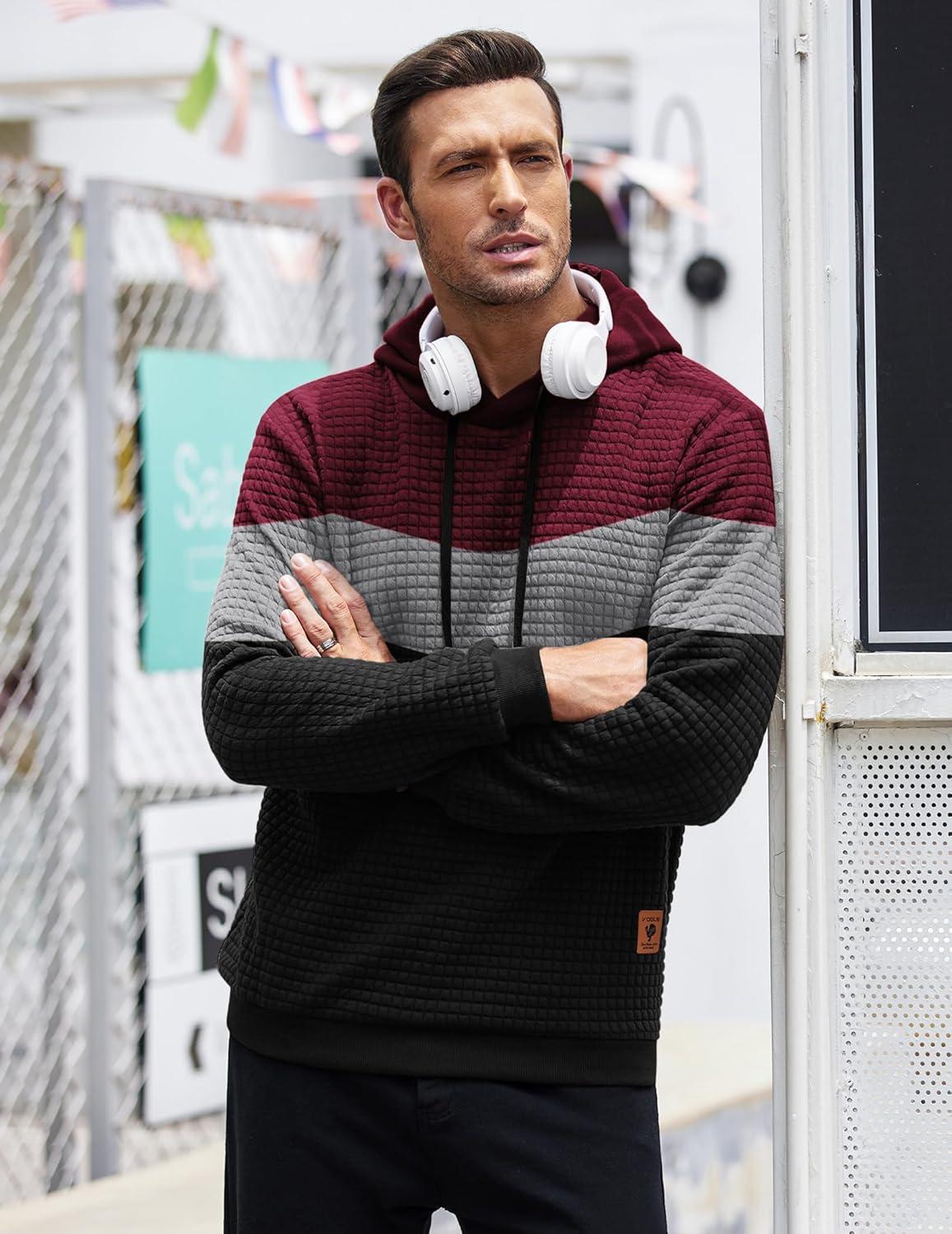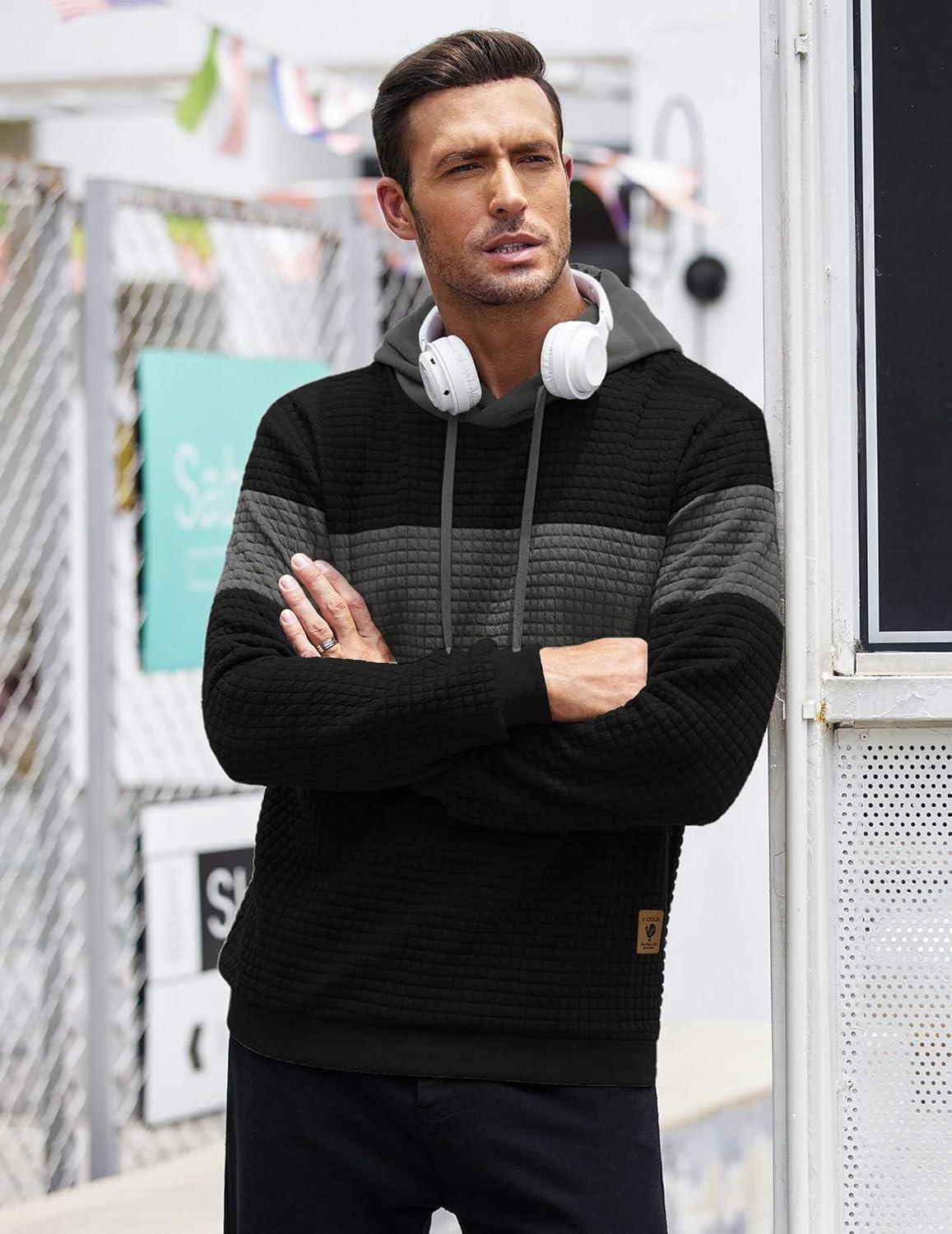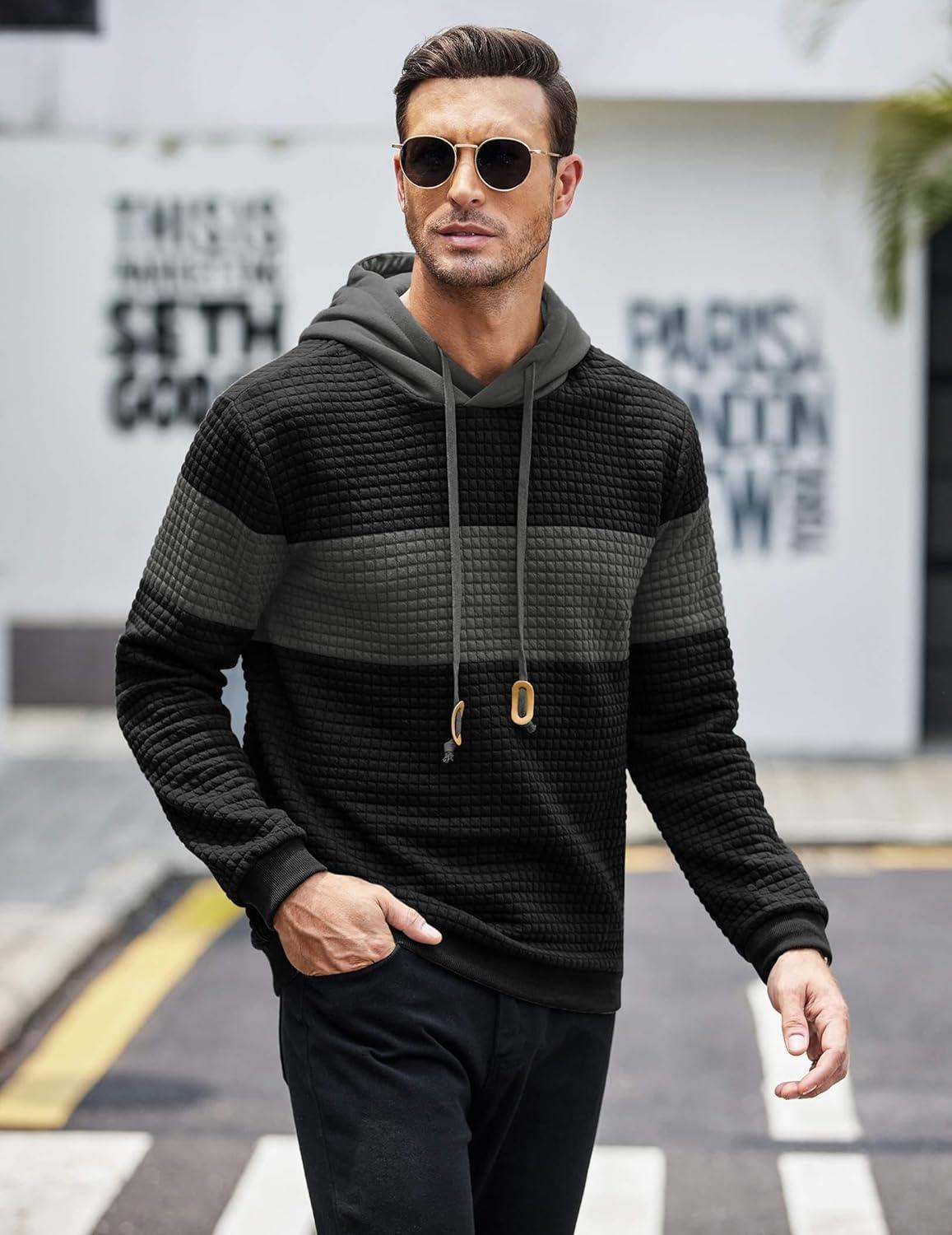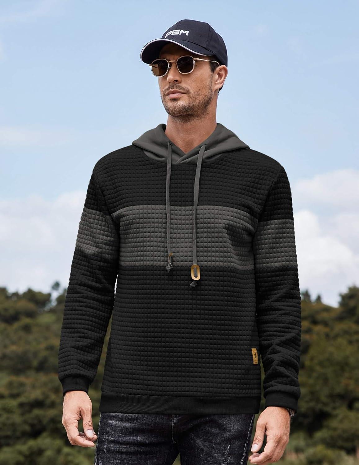 COOFANDY Mens Hooded Sweatshirt Casual Long Sleeve Drawstring Waffle Knit Pullover Hoodies(Pat8(black&light Gray))